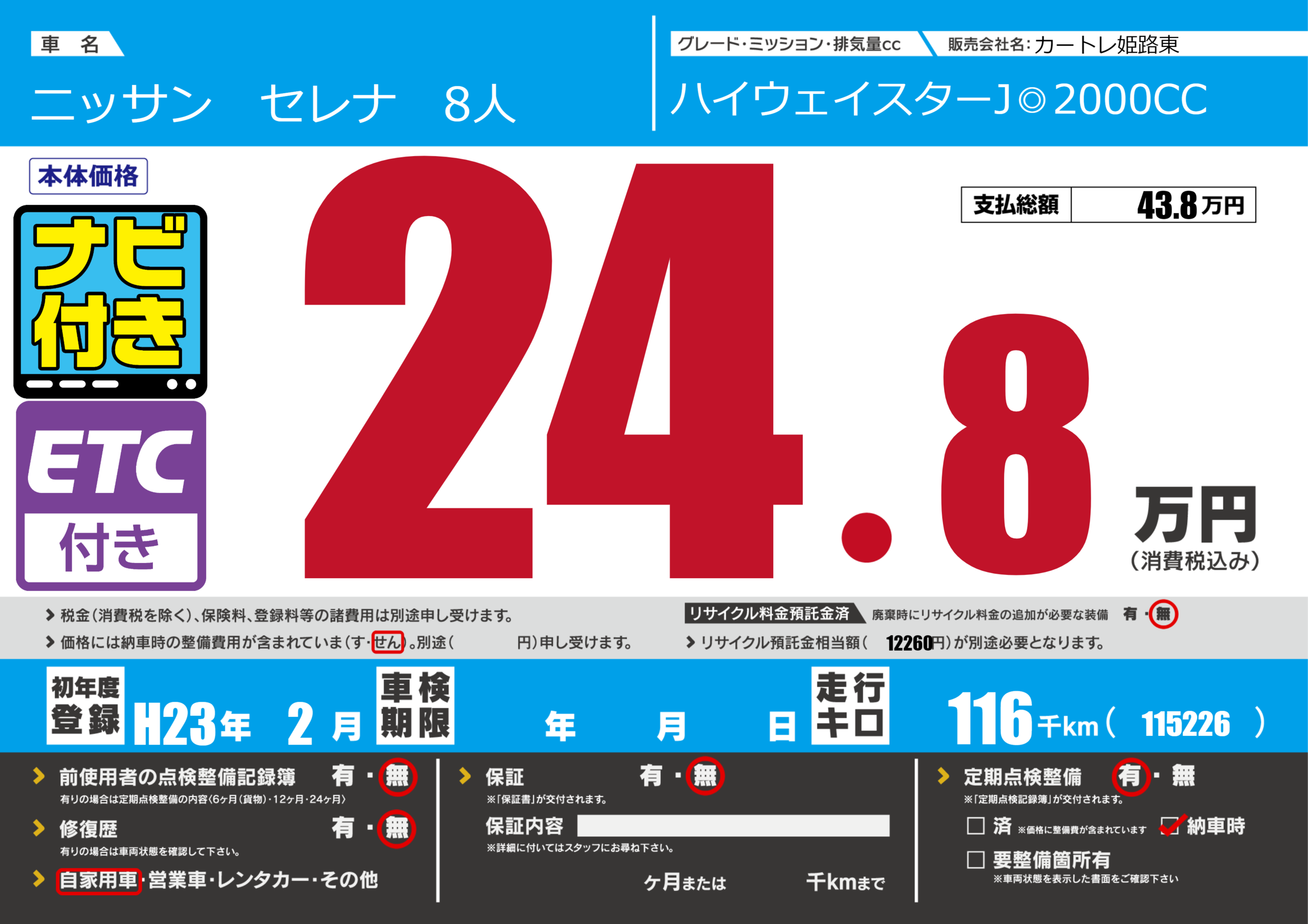 | 走行キロ | 11.6万km | 初年度登録 | H23年2月 |