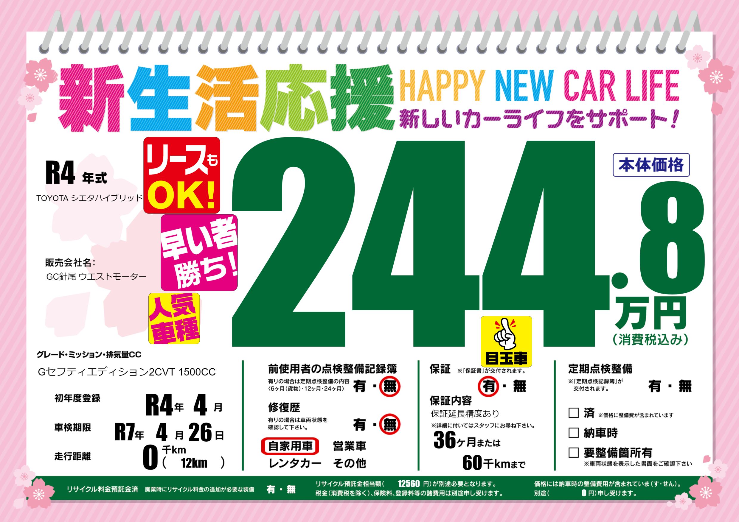 | 車名 | TOYOTA シエタハイブリッド | グレード ミッション 排気量 |