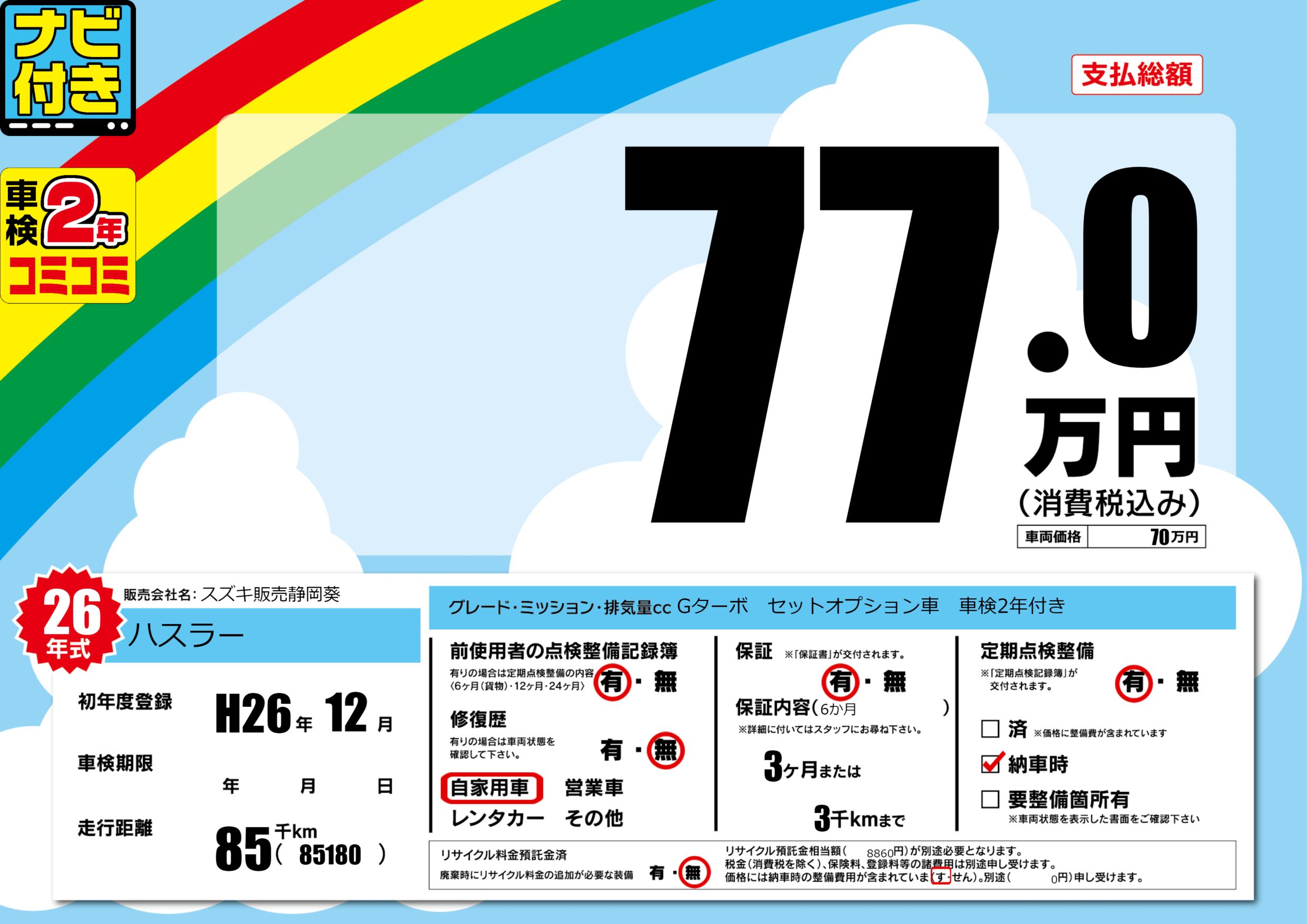 | 定期点検整備 | 定期点検整備あり 納車時あり | ||
