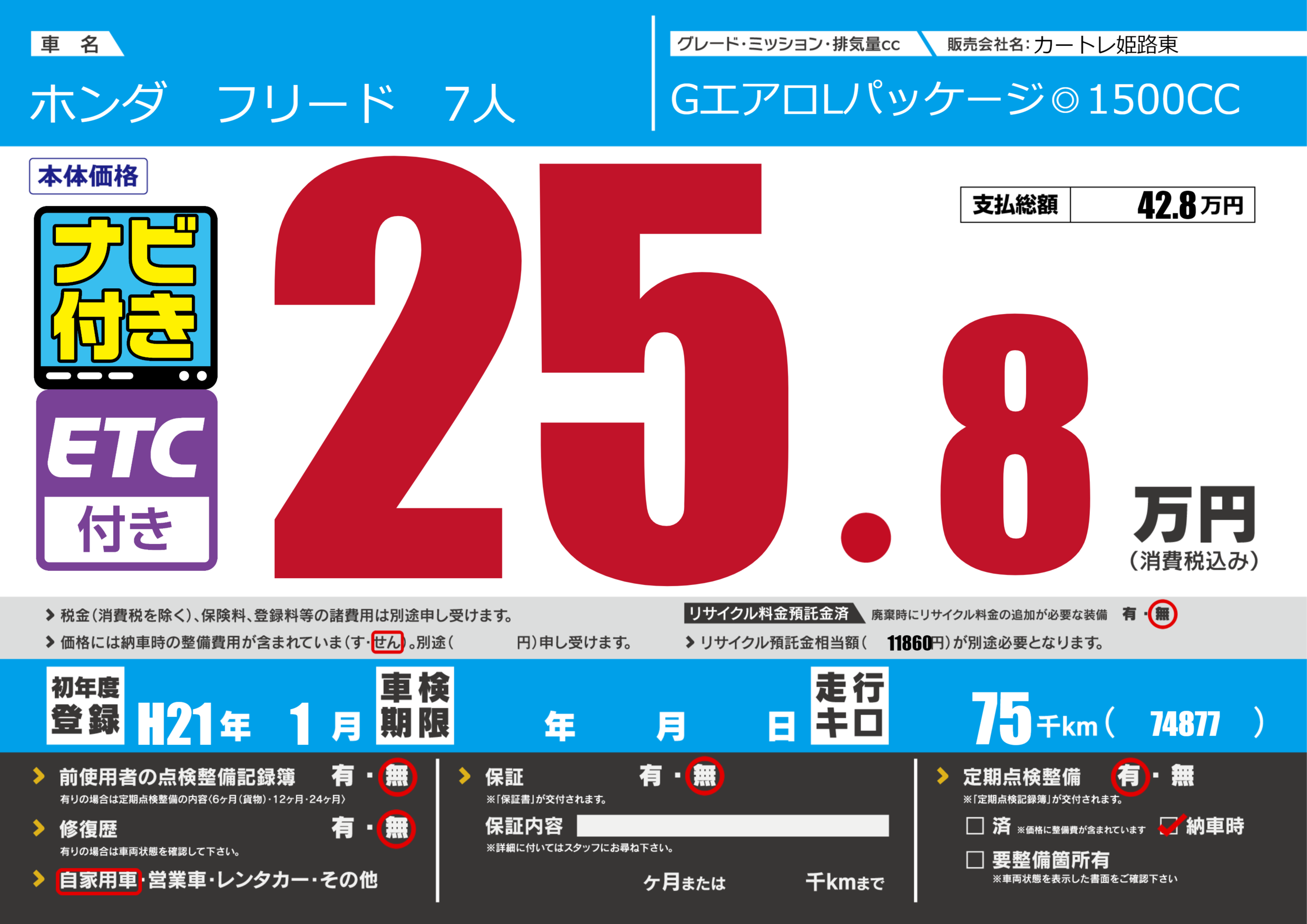 | 車名 | ホンダ フリード 7人 | グレード ミッション 排気量 |