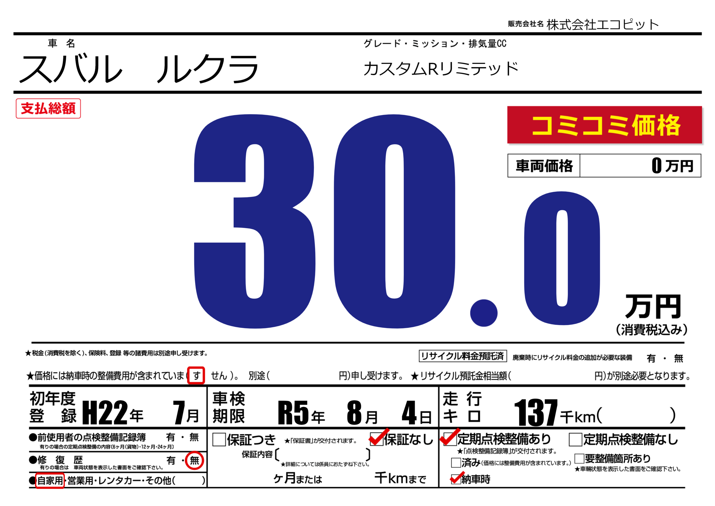 | 走行キロ | 13.7万km | 初年度登録 | H22年7月 |