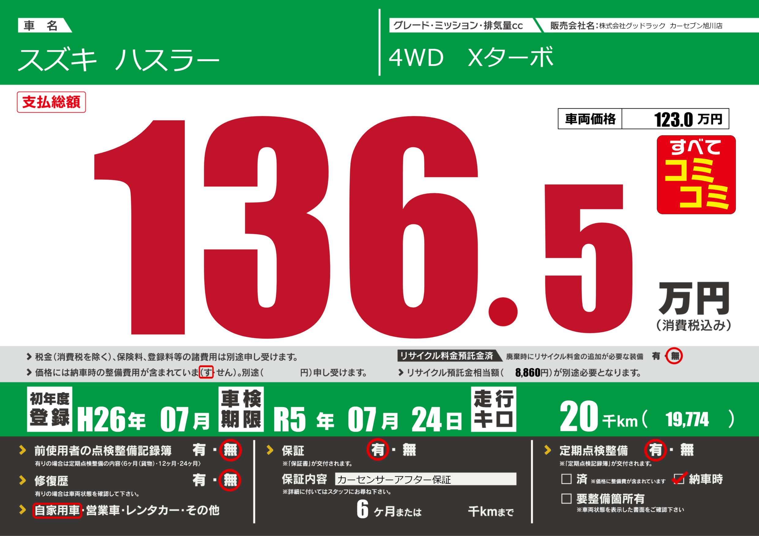 | 車名 | スズキ ハスラー | グレード ミッション 排気量 |