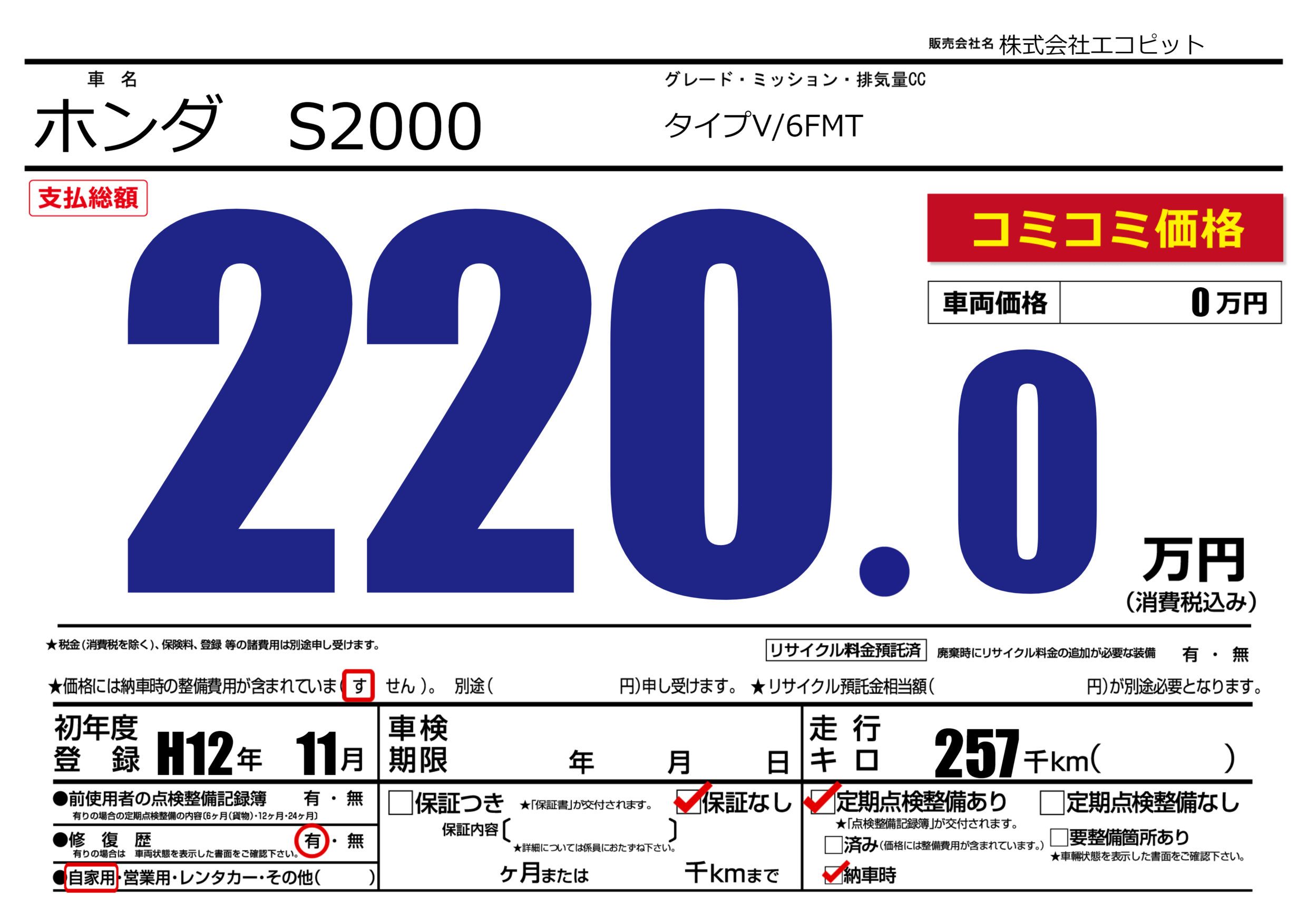 | 車名 | ホンダ S2000 | グレード ミッション 排気量 |