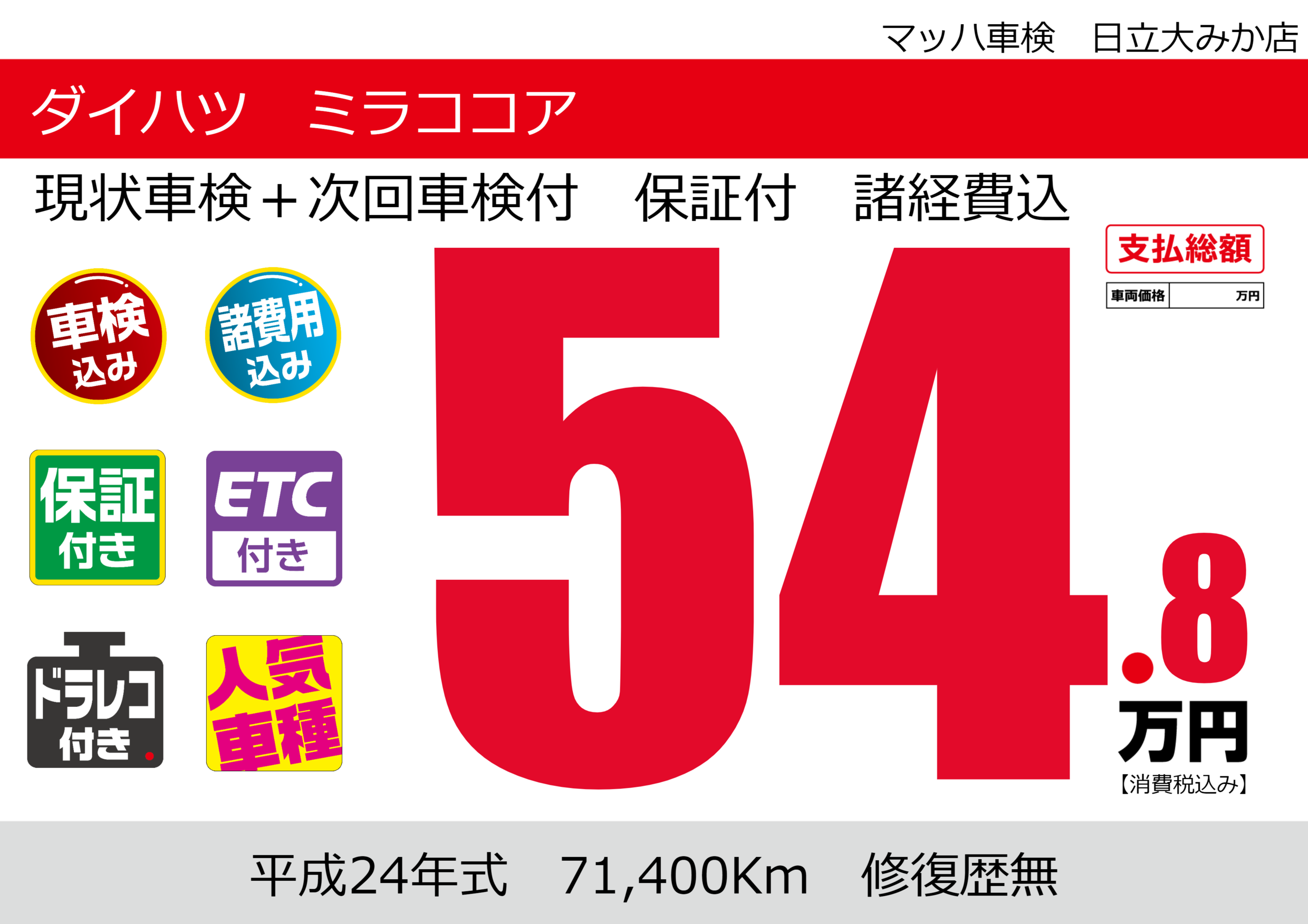 | 車名 | ダイハツ ミラココア | グレード ミッション 排気量 |