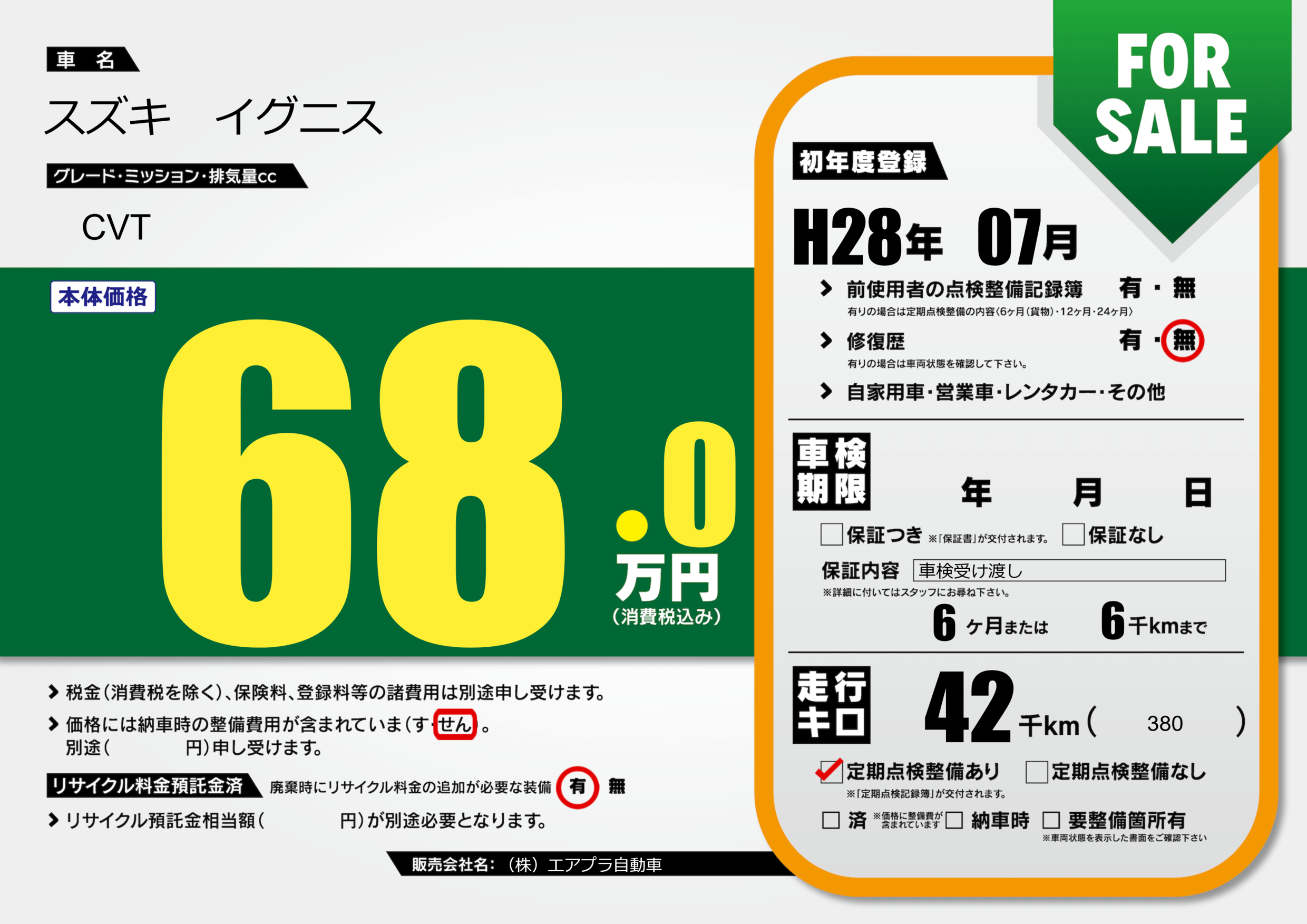保証なし 保証内容(車検受け渡し) 6ヶ月または(6)千kmまで |