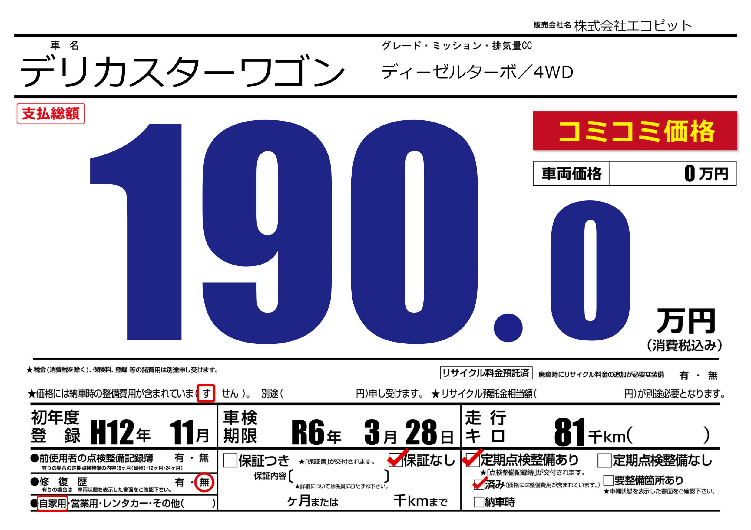 | 定期点検整備 | 定期点検整備あり 定期点検整備済み | ||
