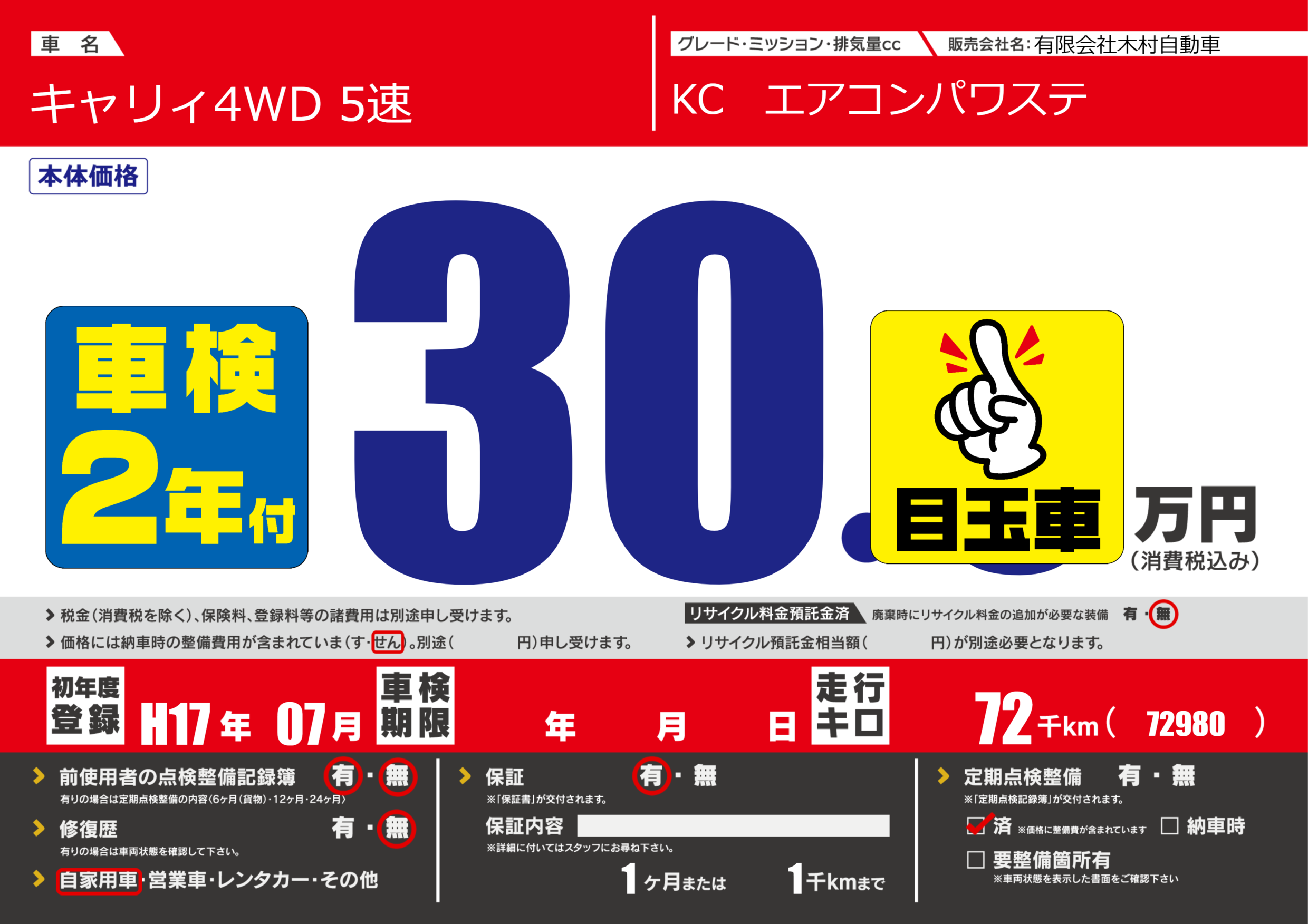 | 車名 | キャリィ4WD 5速 | グレード ミッション 排気量 |