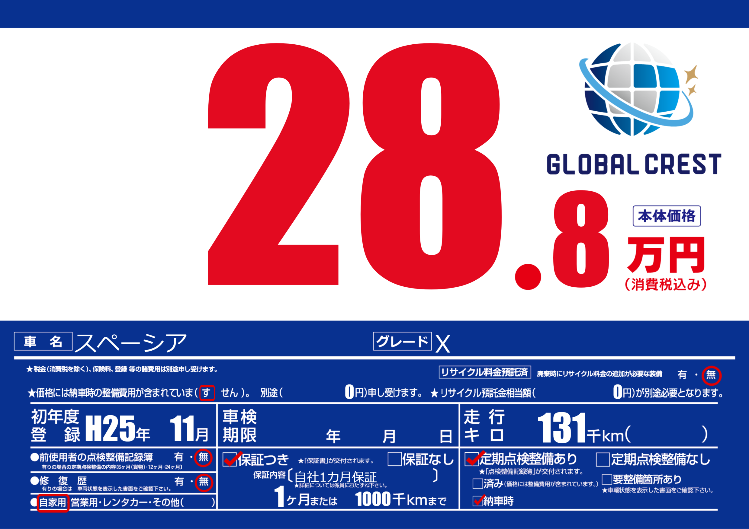 | 車名 | スペーシア | グレード ミッション 排気量 |