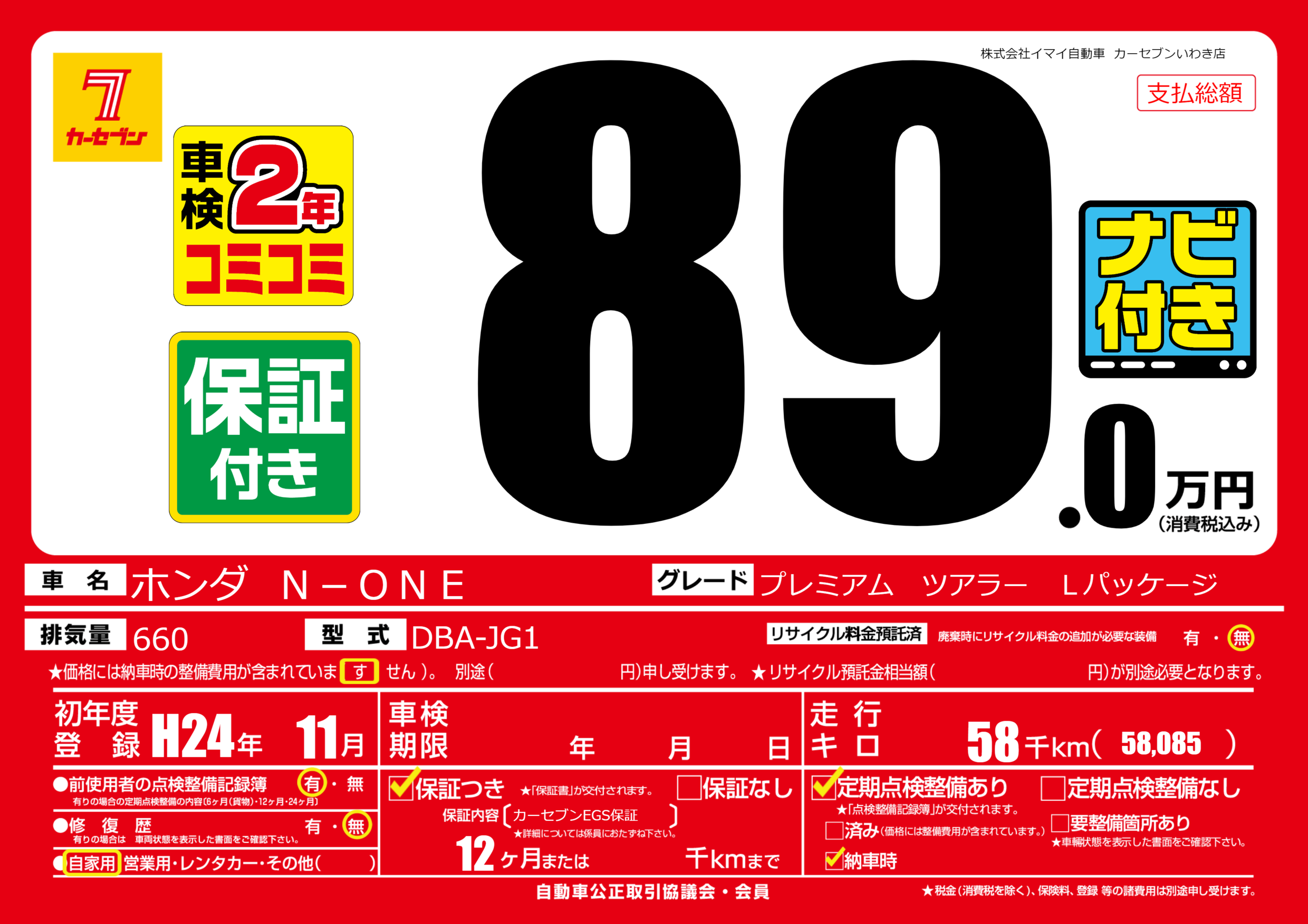 | 車名 | ホンダ N-ONE | グレード ミッション 排気量 |