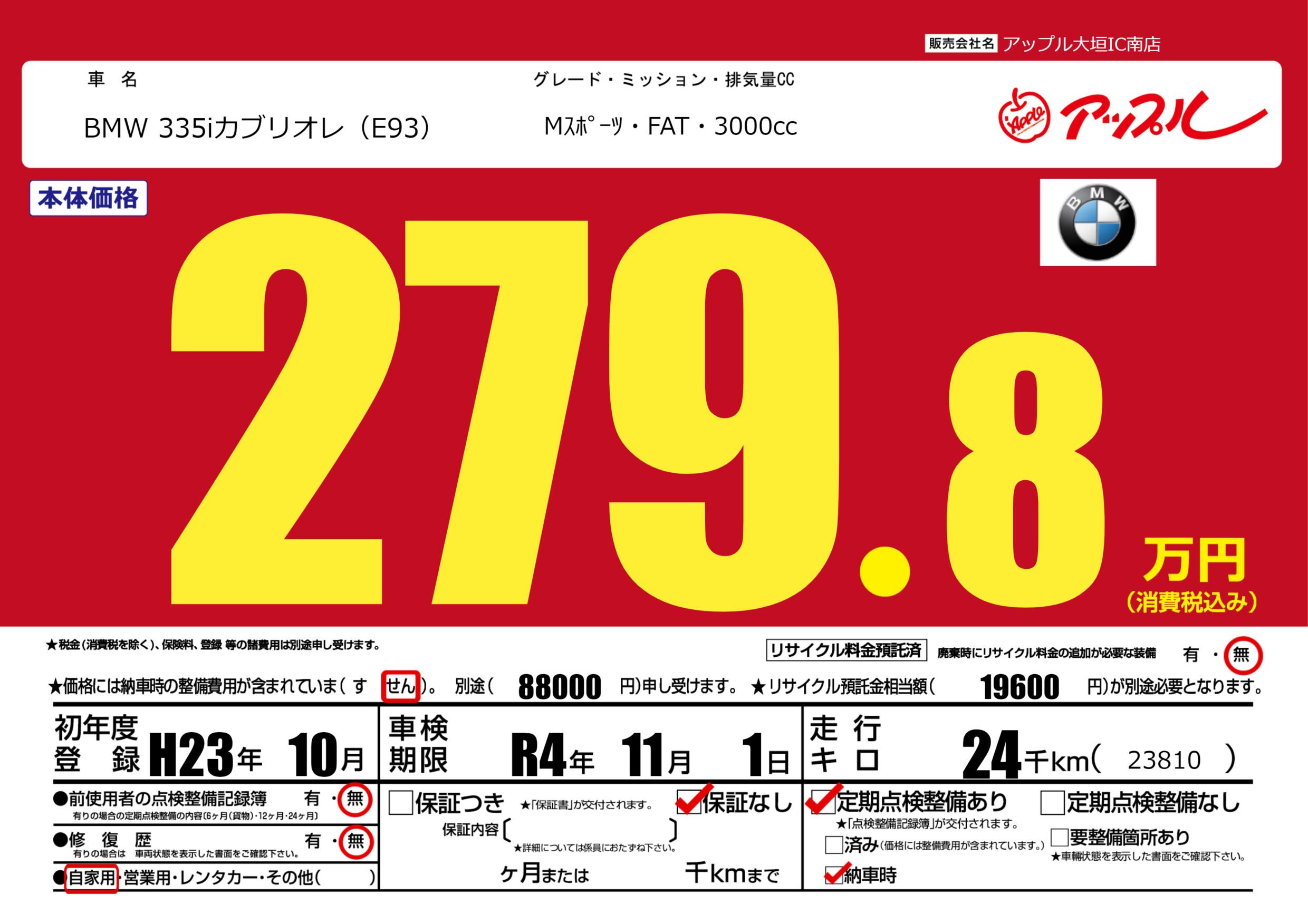 | 車名 | BMW 335iカブリオレ(E93) | グレード ミッション 排気量 |