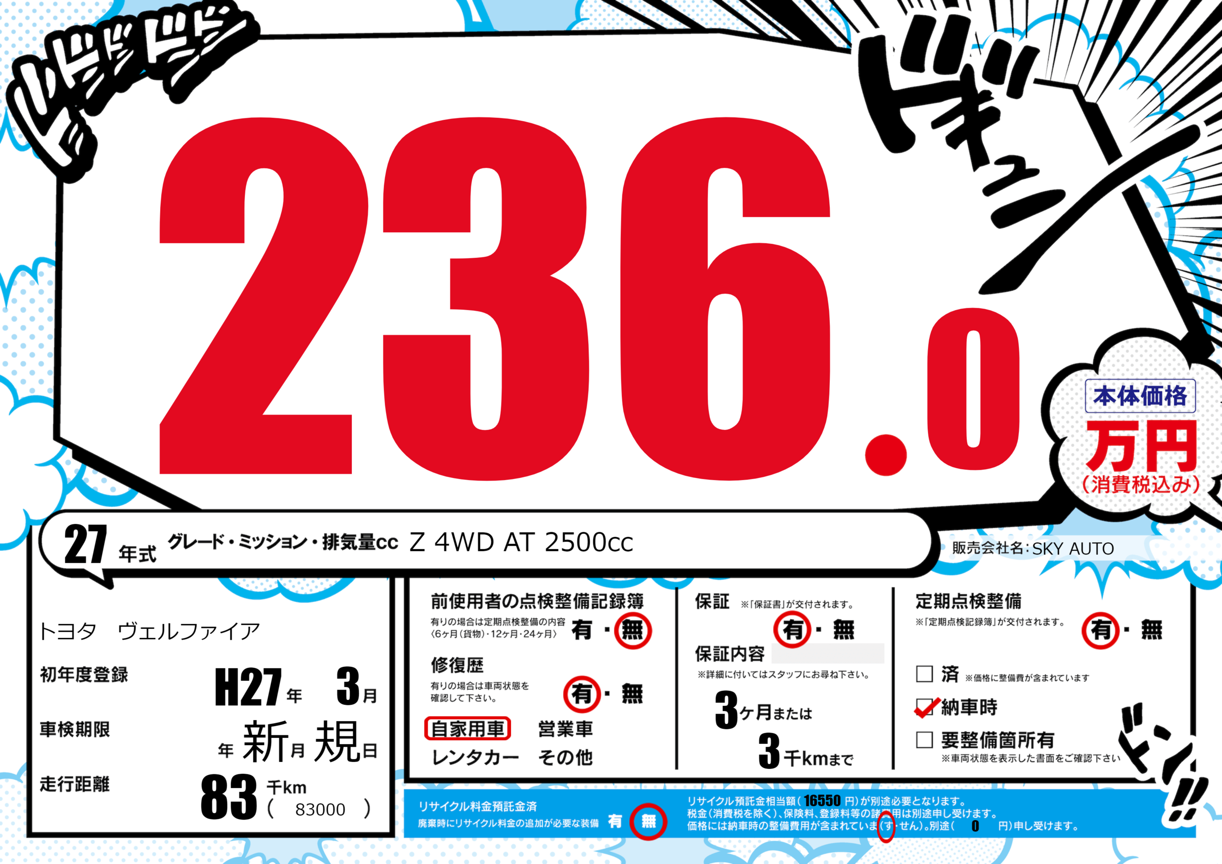 | 走行キロ | 8.3万km | 初年度登録 | H27年3月 |
