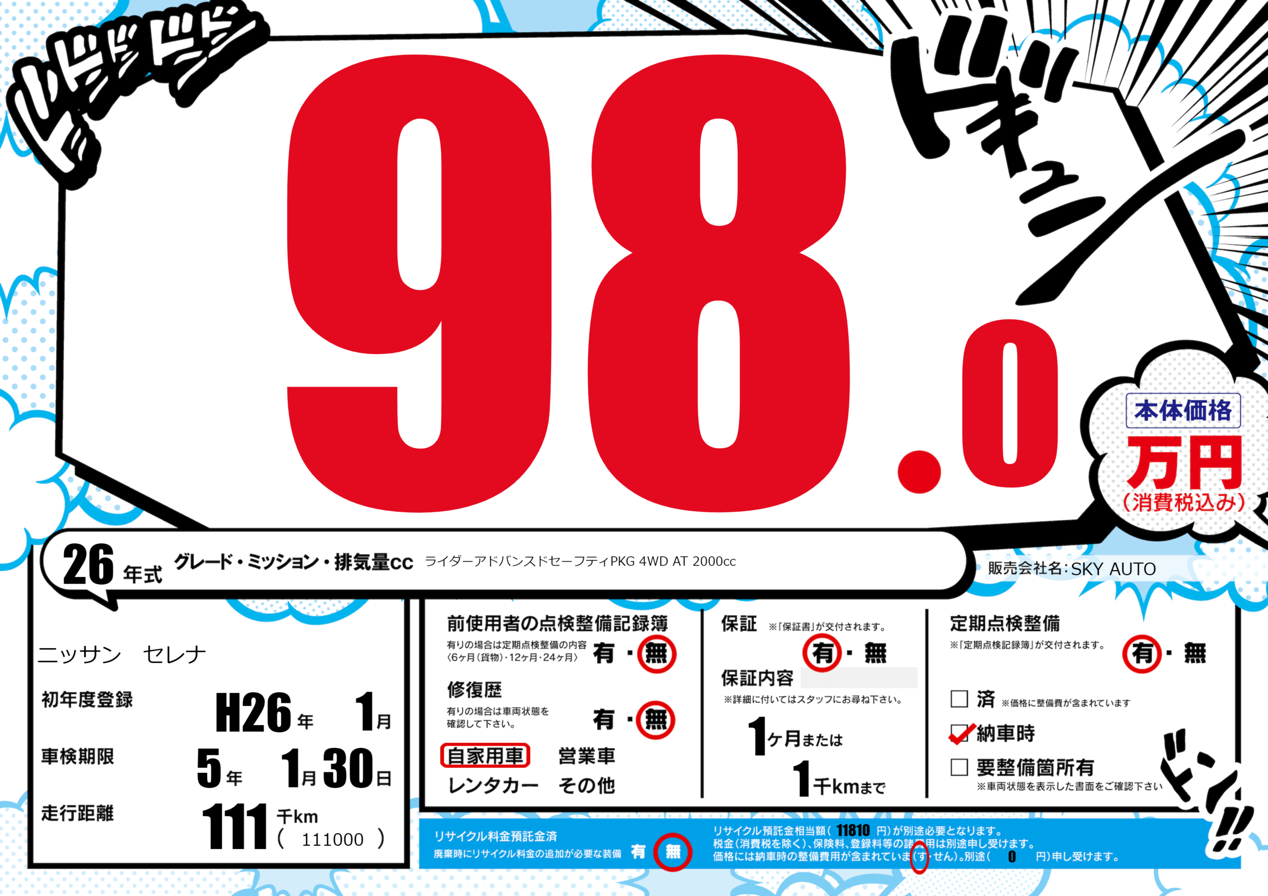 | 走行キロ | 11.1万km | 初年度登録 | H26年1月 |