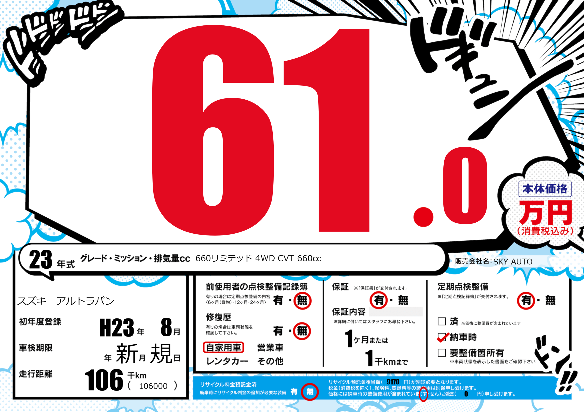 | 走行キロ | 10.6万km | 初年度登録 | H23年8月 |