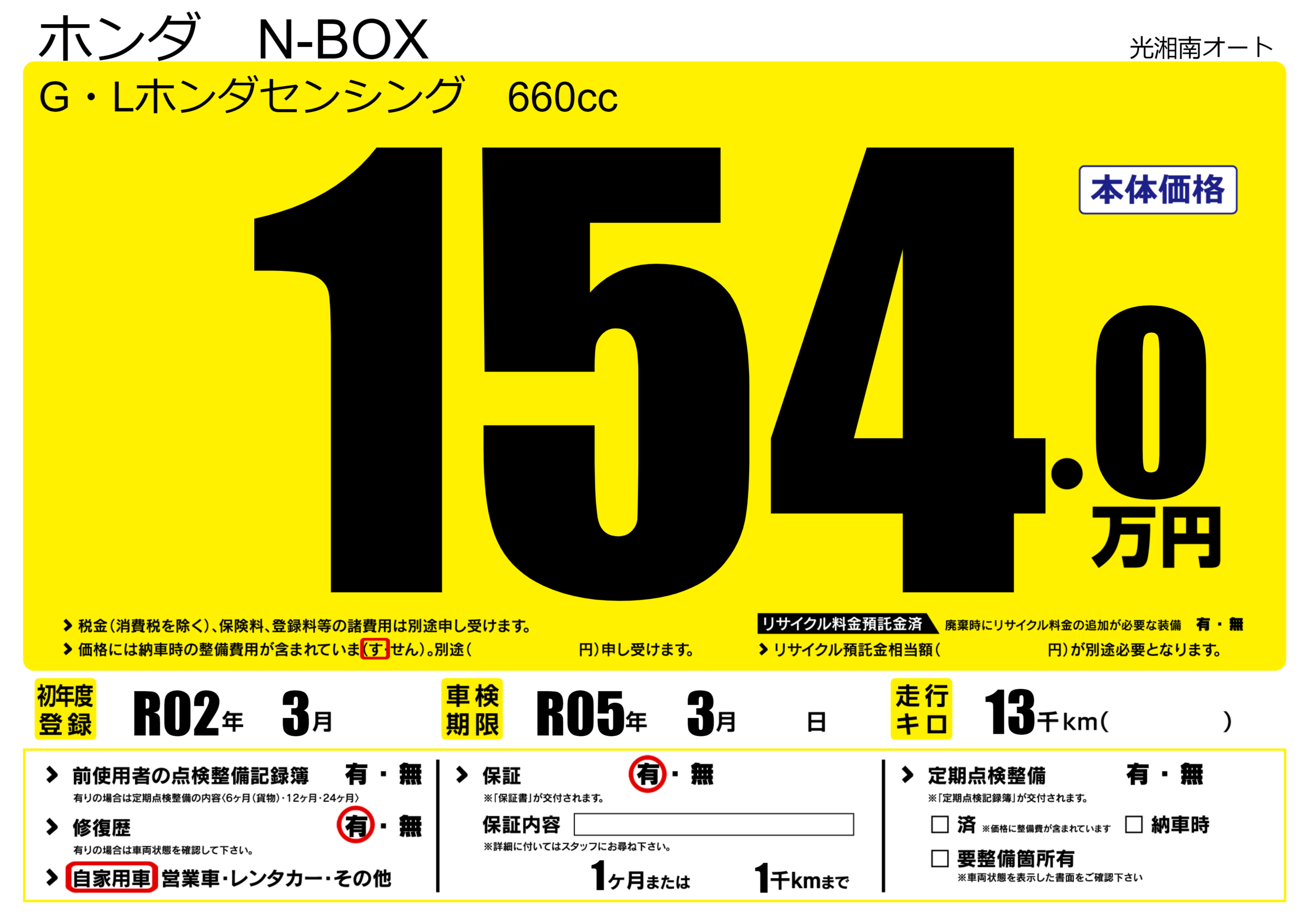 | 車名 | ホンダ N-BOX | グレード ミッション 排気量 |