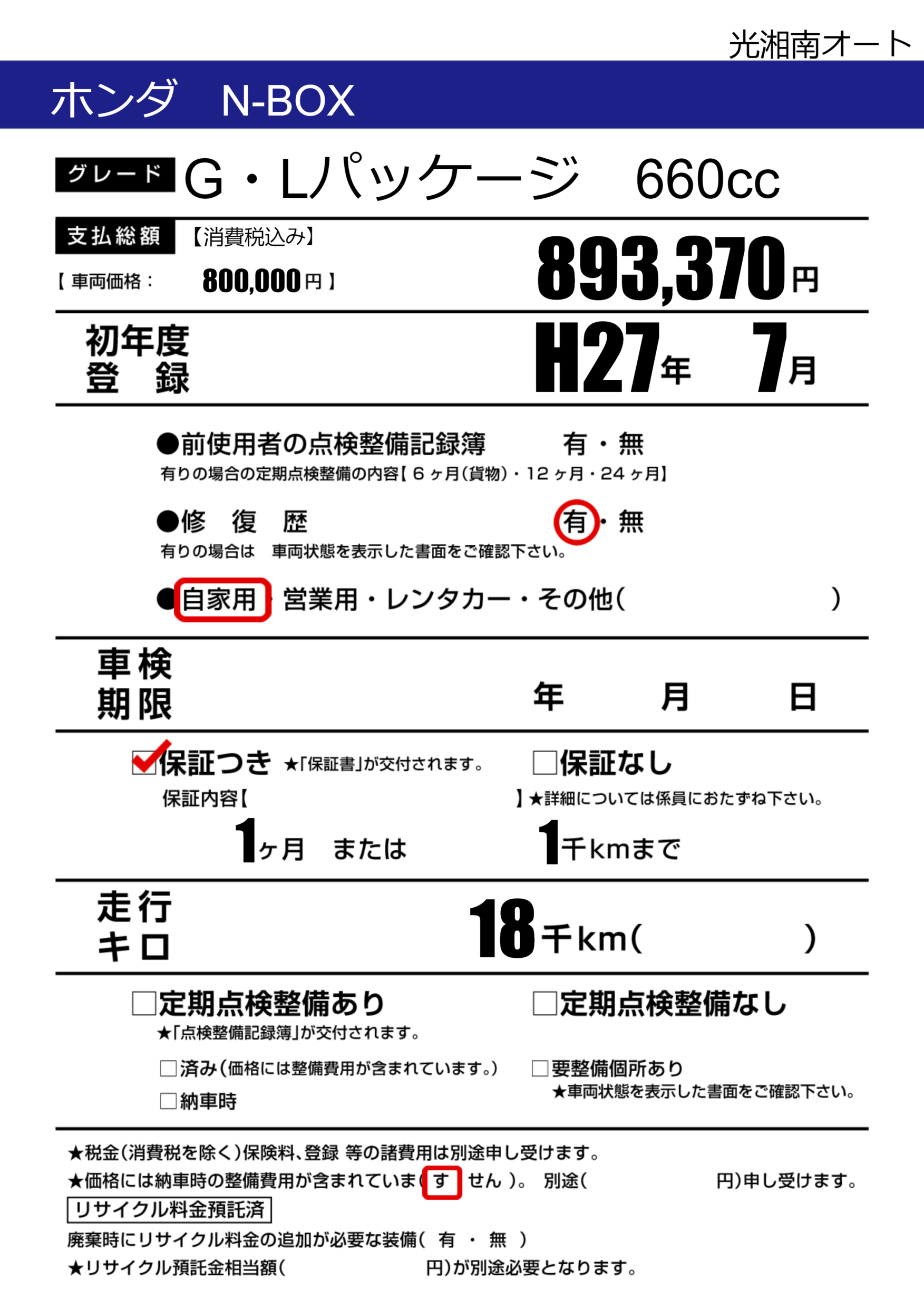 保証付き 保証内容(---) 1ヶ月または(1)千kmまで |