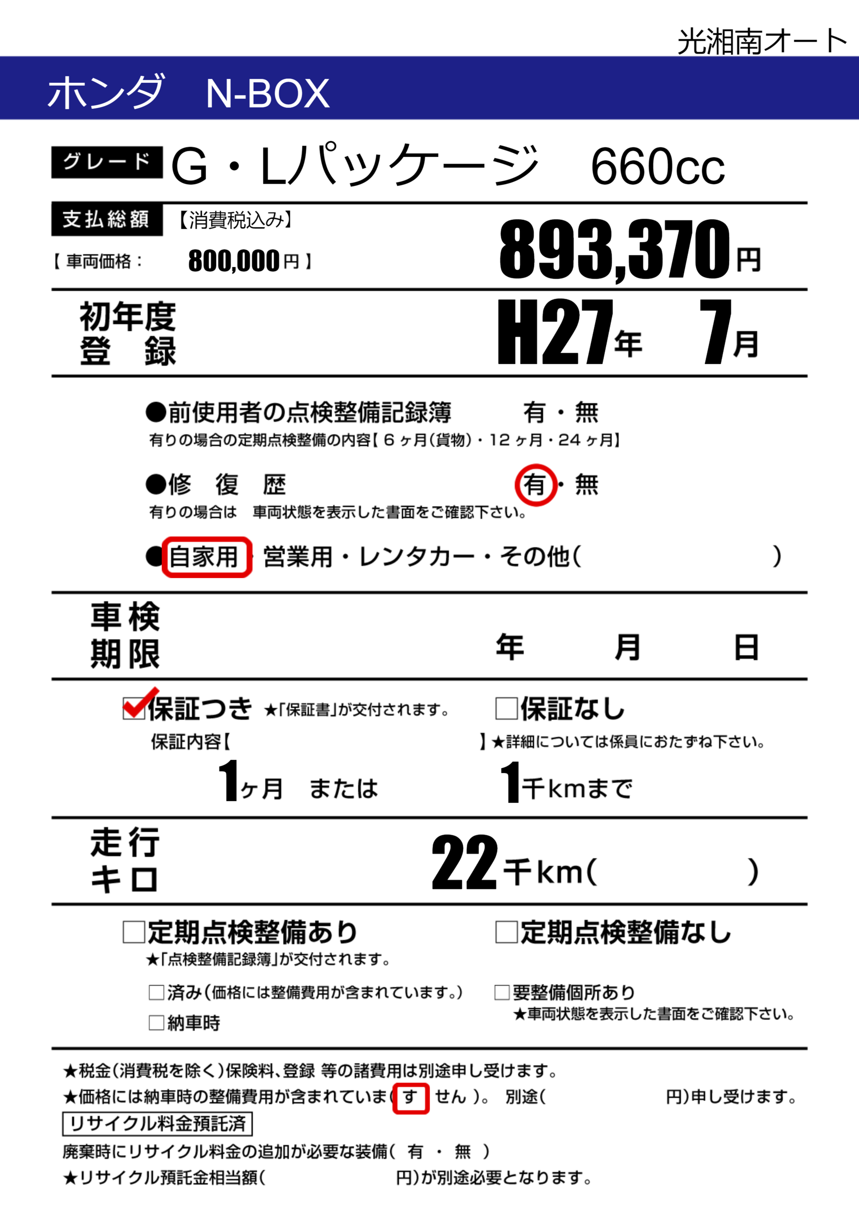 | 車名 | ホンダ N-BOX | グレード ミッション 排気量 |