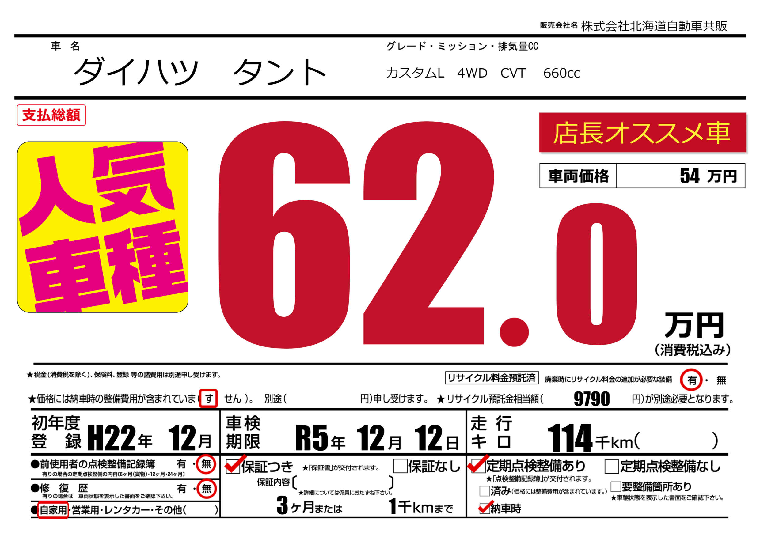 | 車名 | ダイハツ タント | グレード ミッション 排気量 |