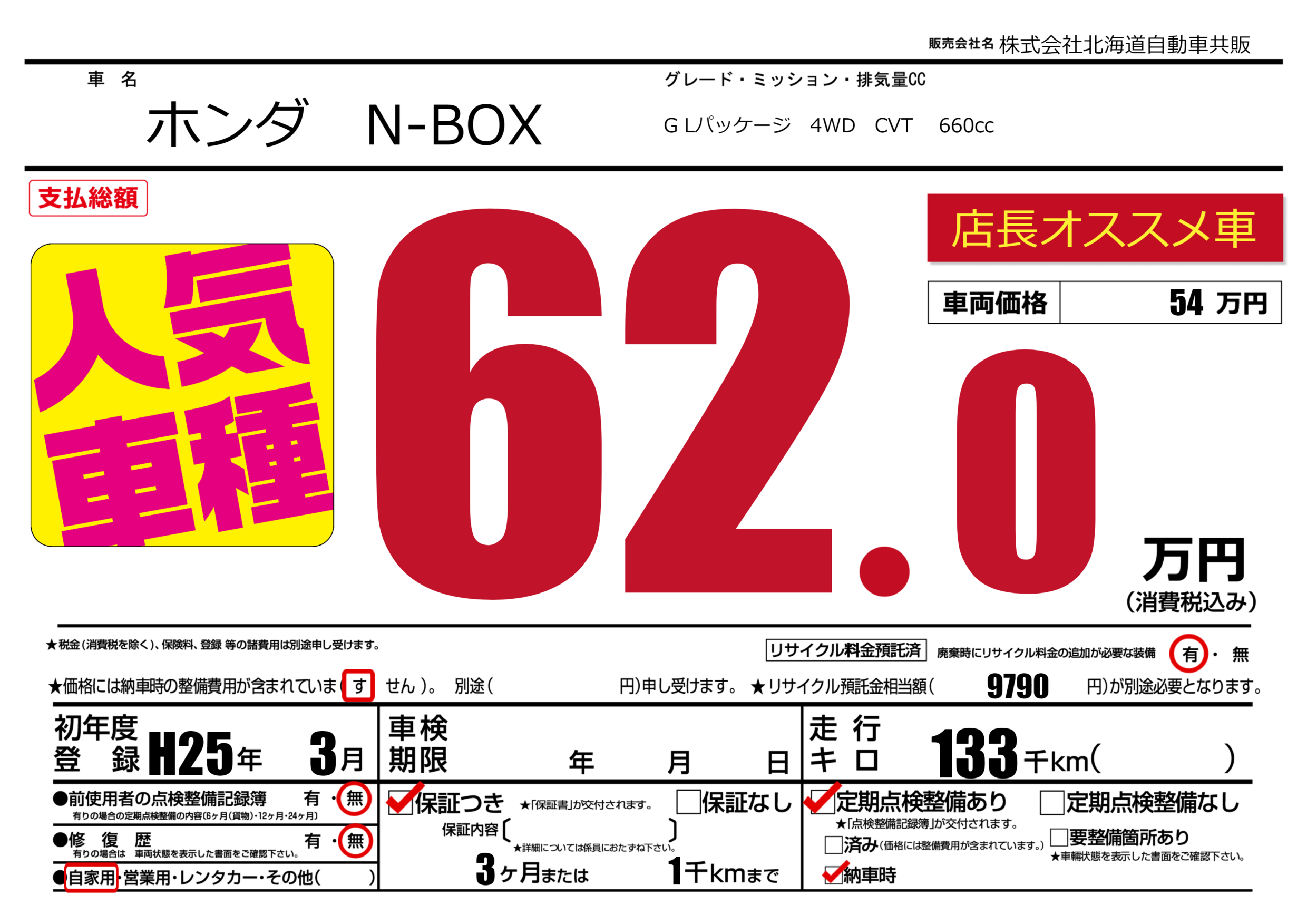 | 車名 | ホンダ N-BOX | グレード ミッション 排気量 |