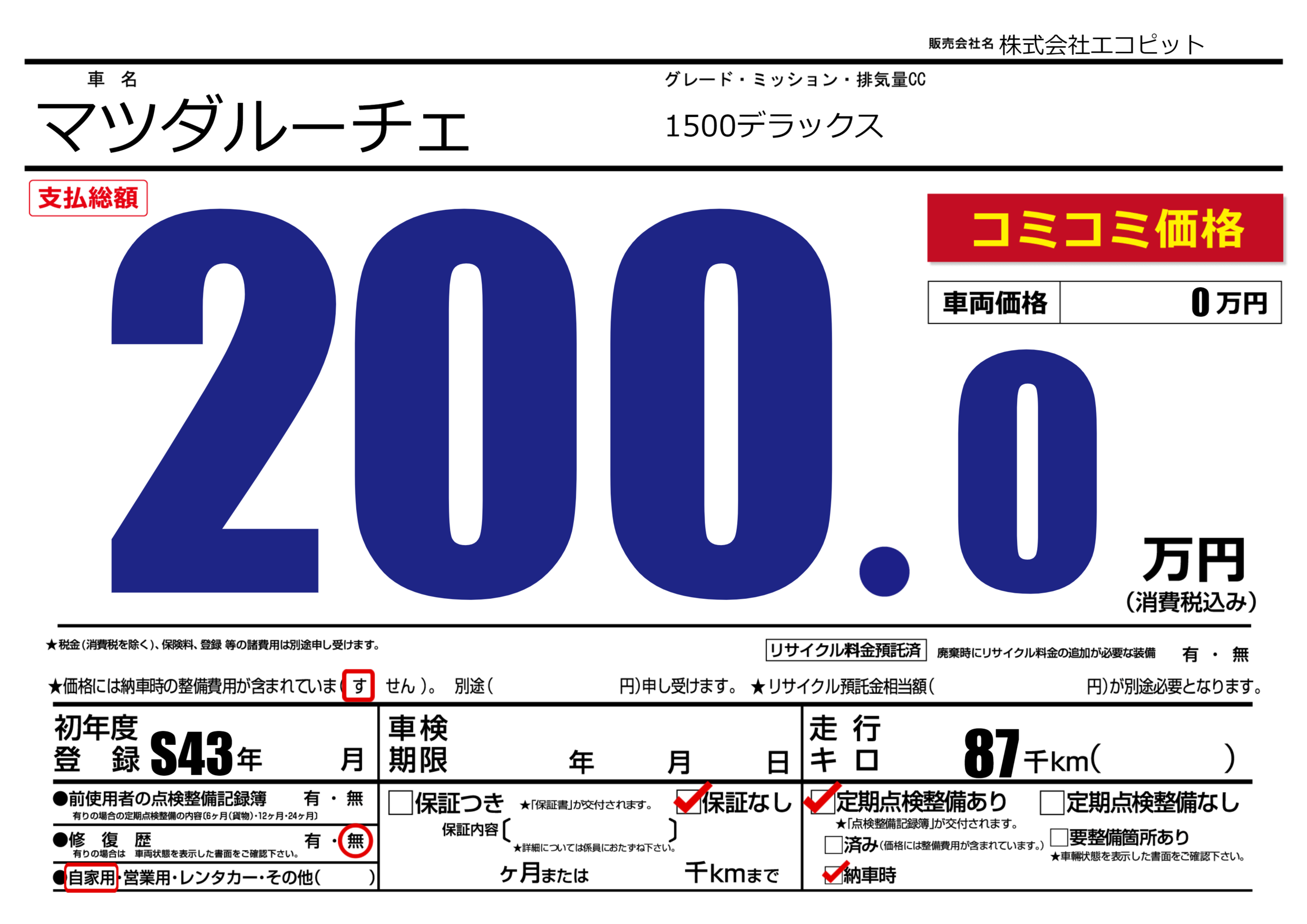 | 車検制限 | - 年 - 月 - 日 | ||