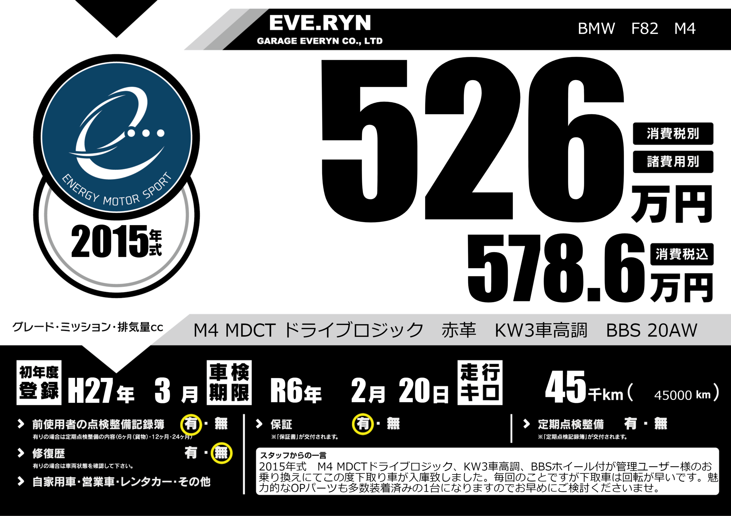 | 車名 | BMW F82 M4 | グレード ミッション 排気量 |