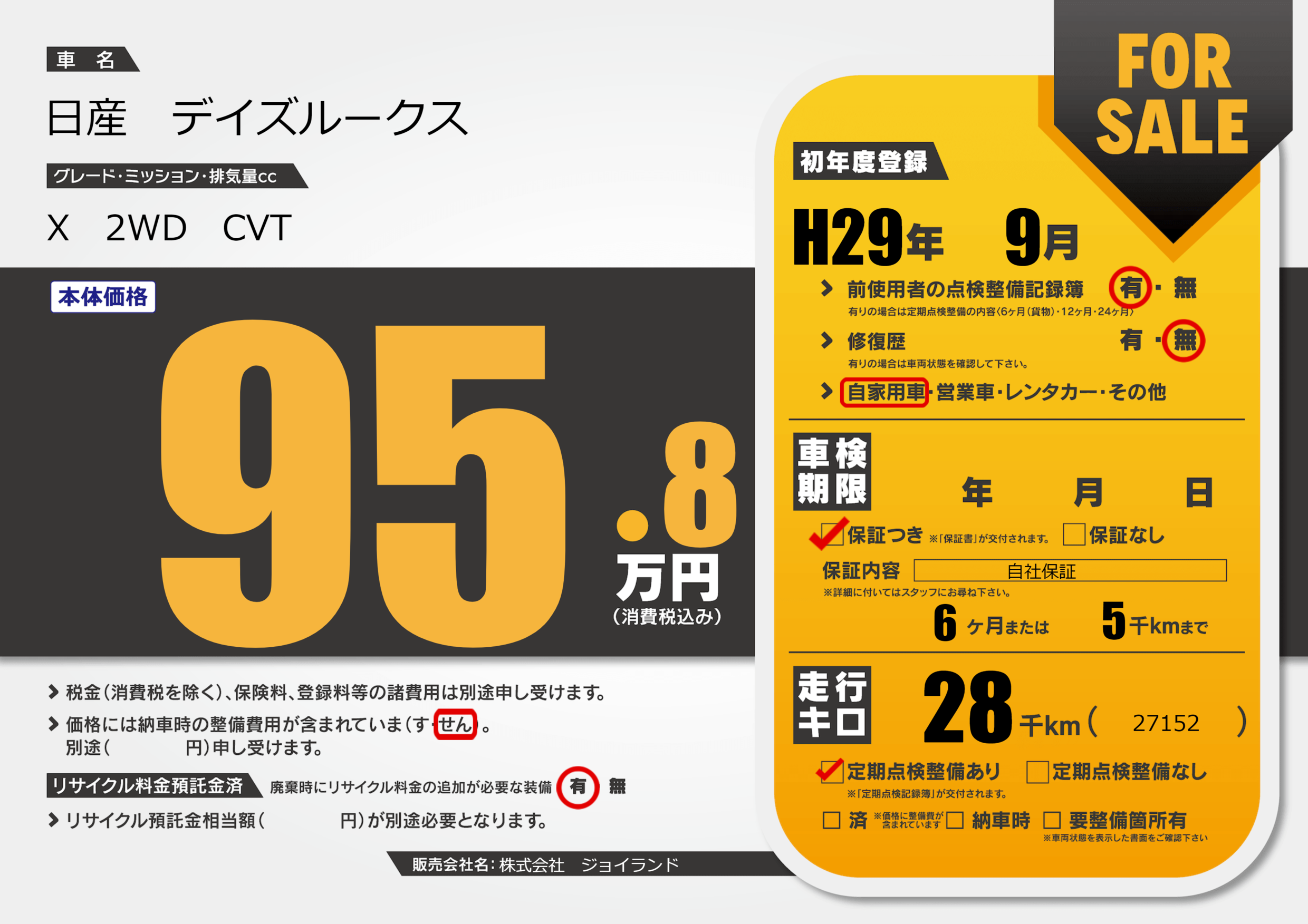 | 車名 | 日産 デイズルークス | グレード ミッション 排気量 |