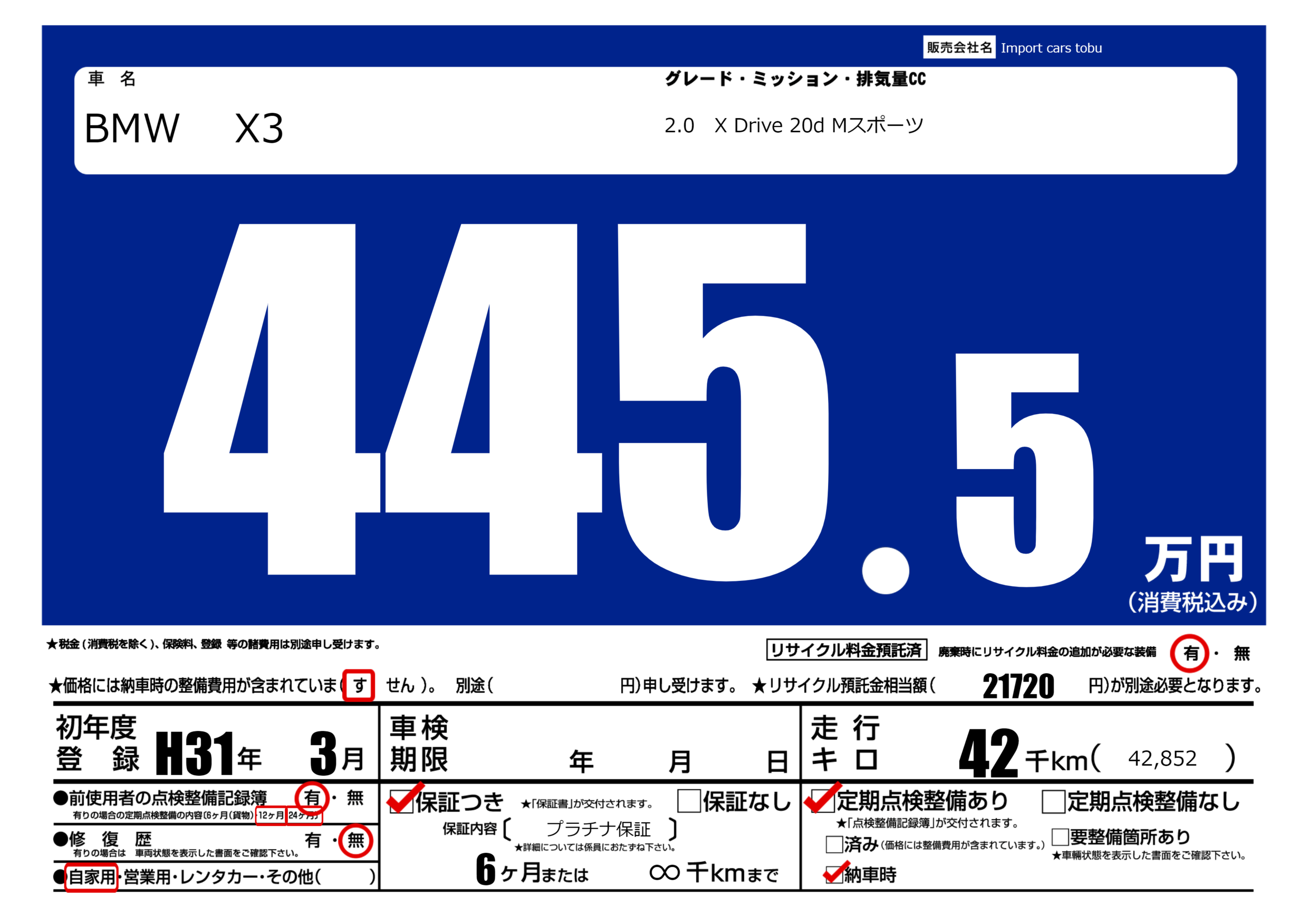 保証付き 保証内容( プラチナ保証) 6ヶ月または(∞)千kmまで |