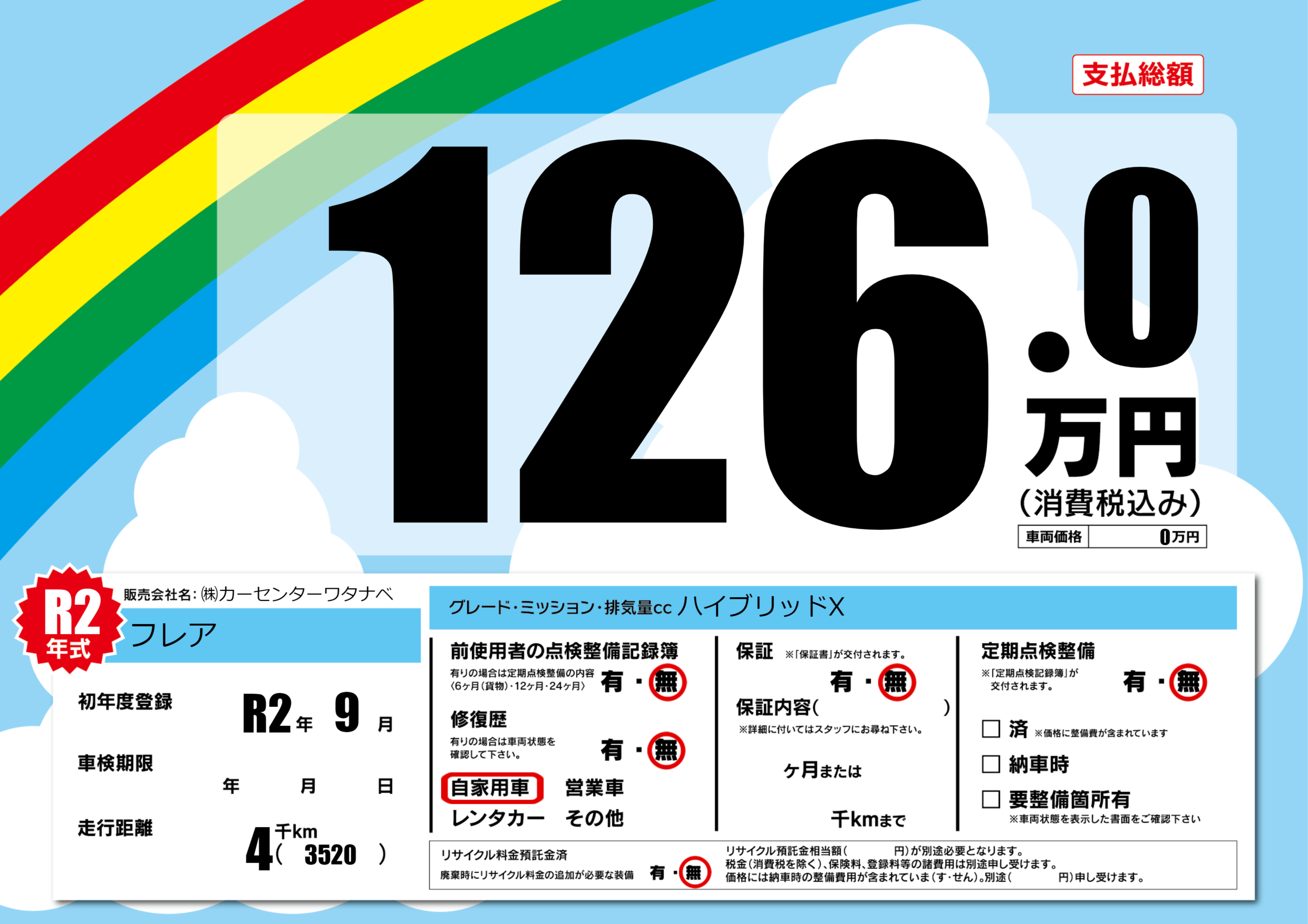 | 走行キロ | 0.4万km | 初年度登録 | R2年9月 |