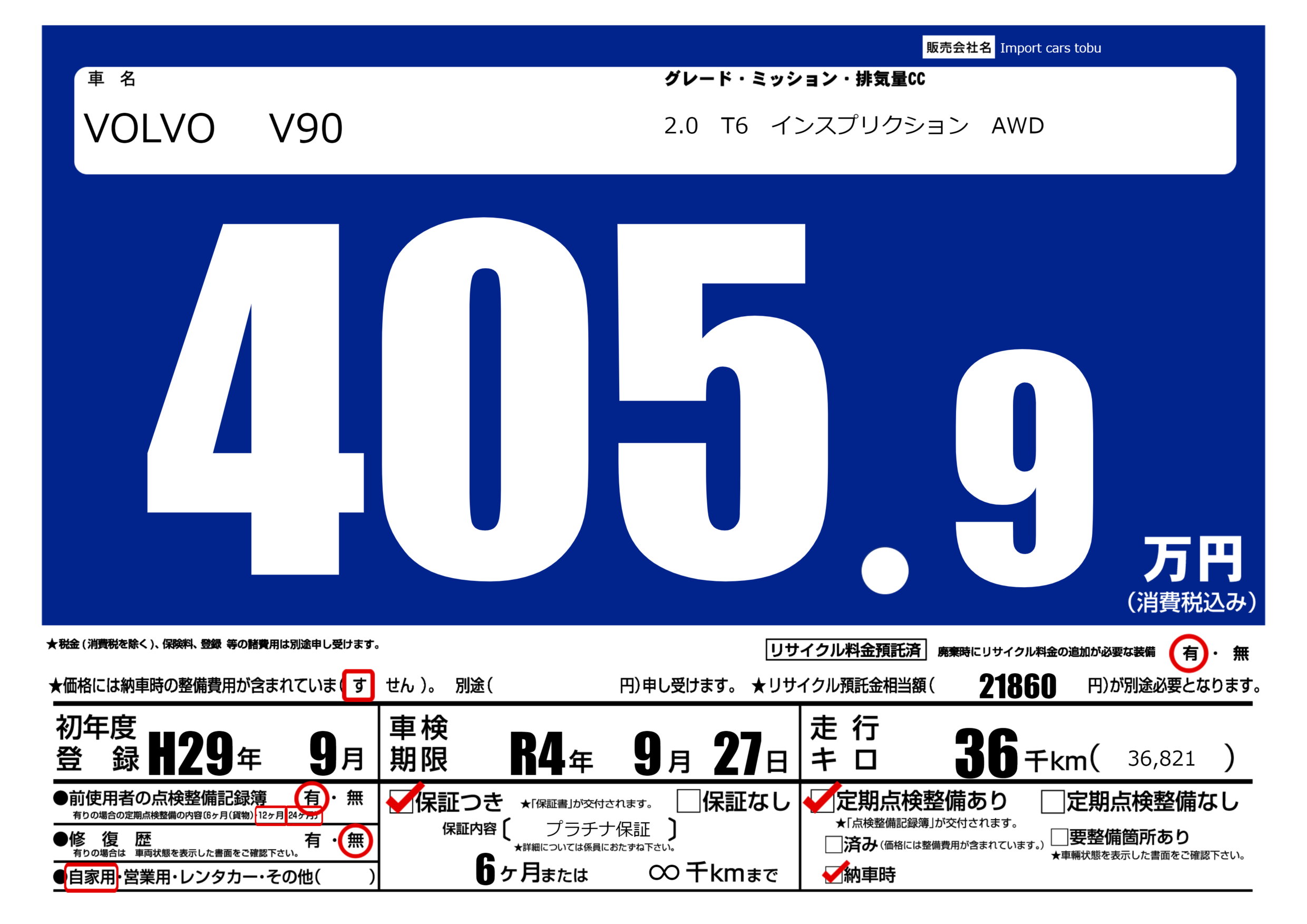 | 車名 | VOLVO V90 | グレード ミッション 排気量 |