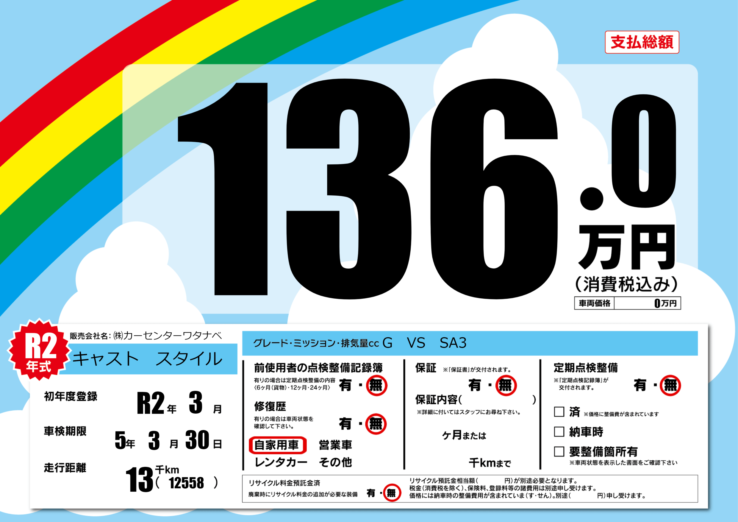 | 走行キロ | 1.3万km | 初年度登録 | R2年3月 |