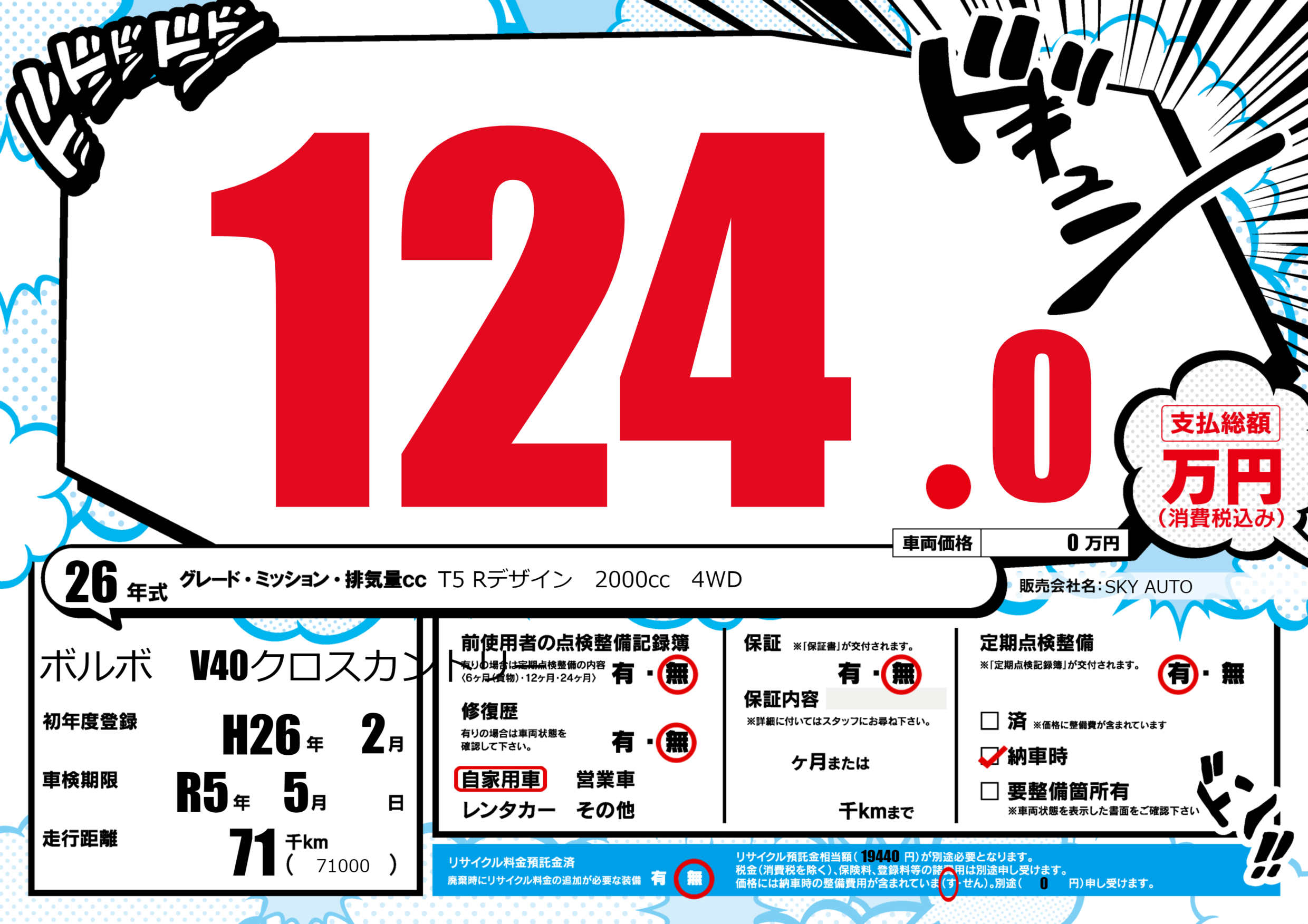 | 車名 | ボルボ V40クロスカントリー | グレード ミッション 排気量 |