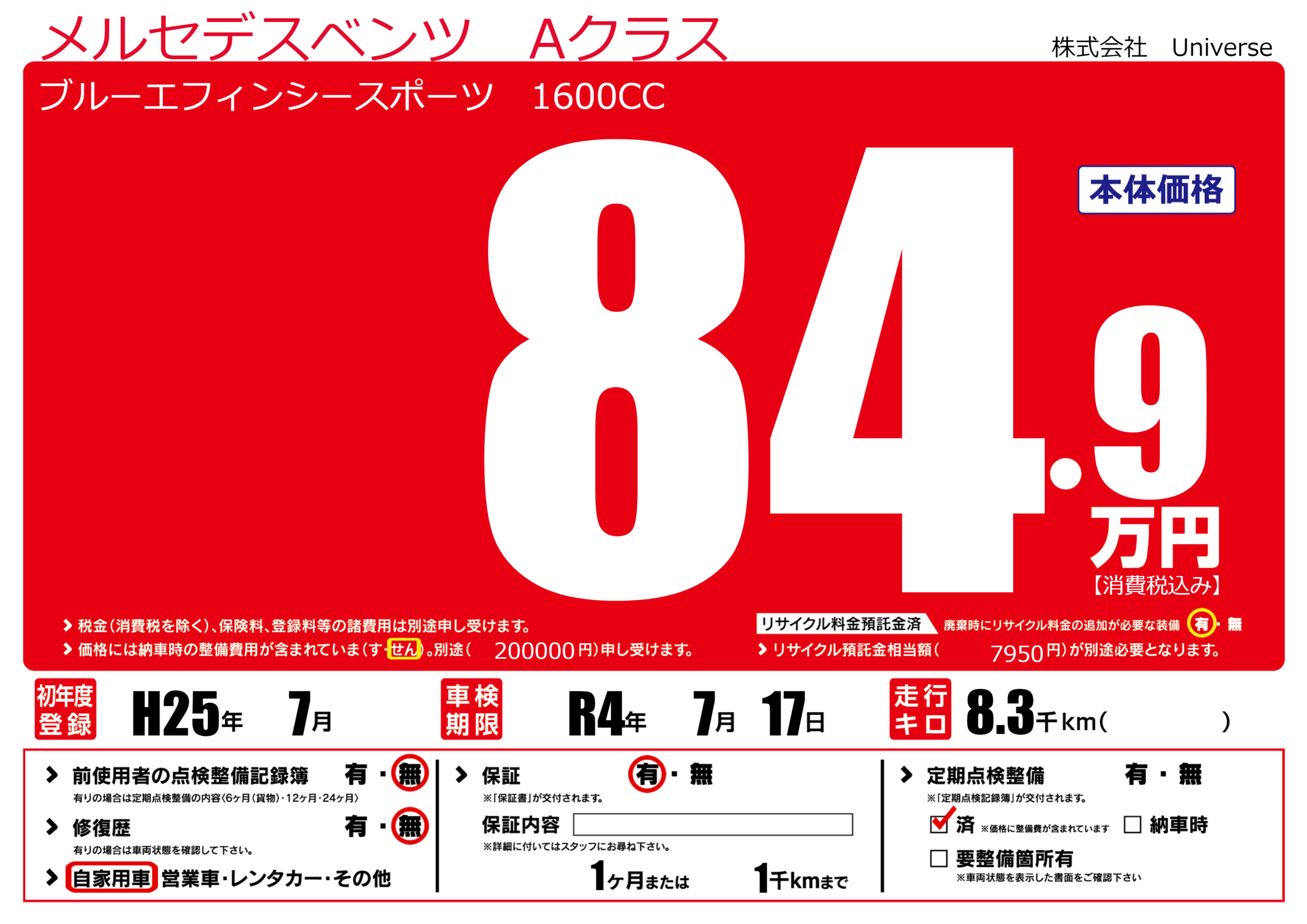 | 車名 | メルセデスベンツ Aクラス | グレード ミッション 排気量 |