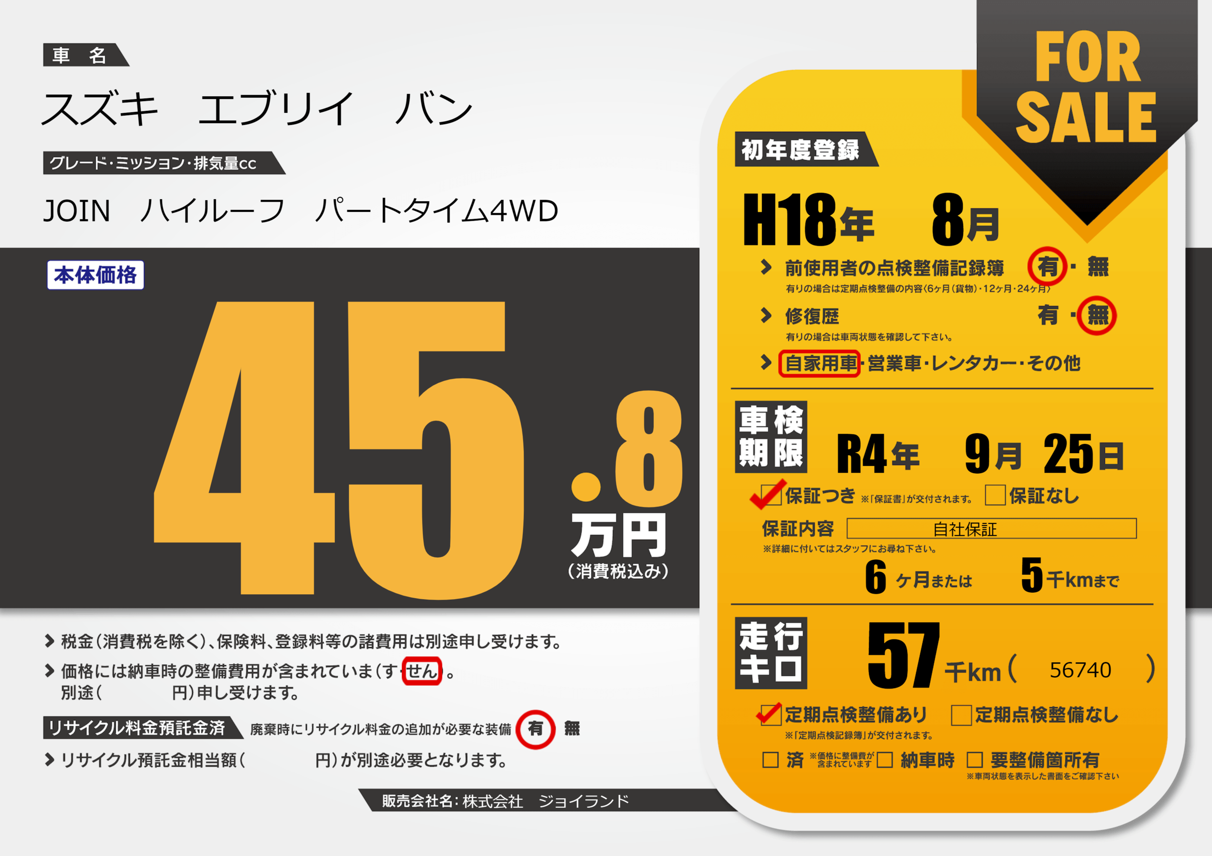 | 車名 | スズキ エブリイ バン | グレード ミッション 排気量 |