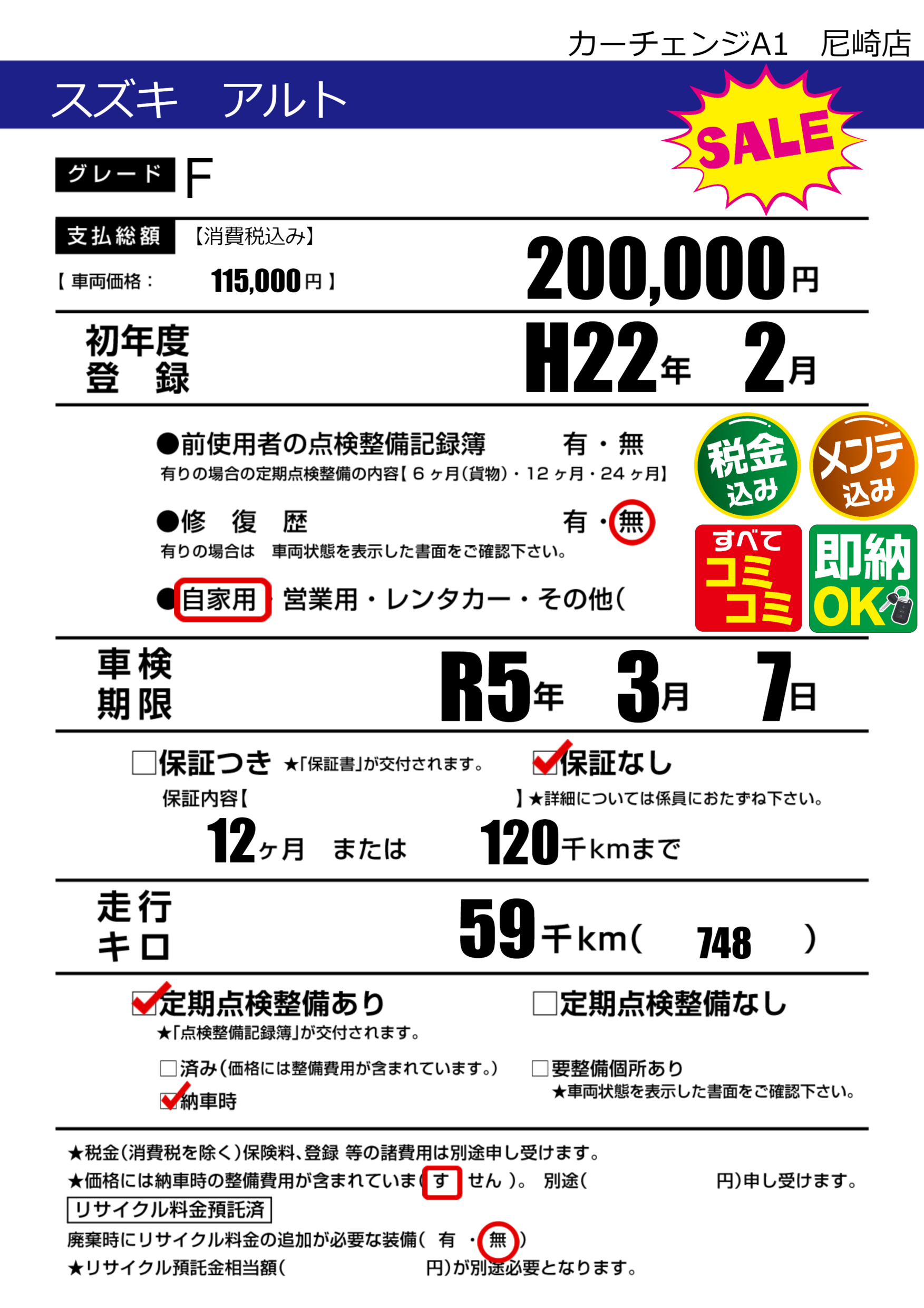 定期点検整備 定期点検整備あり 納車時あり