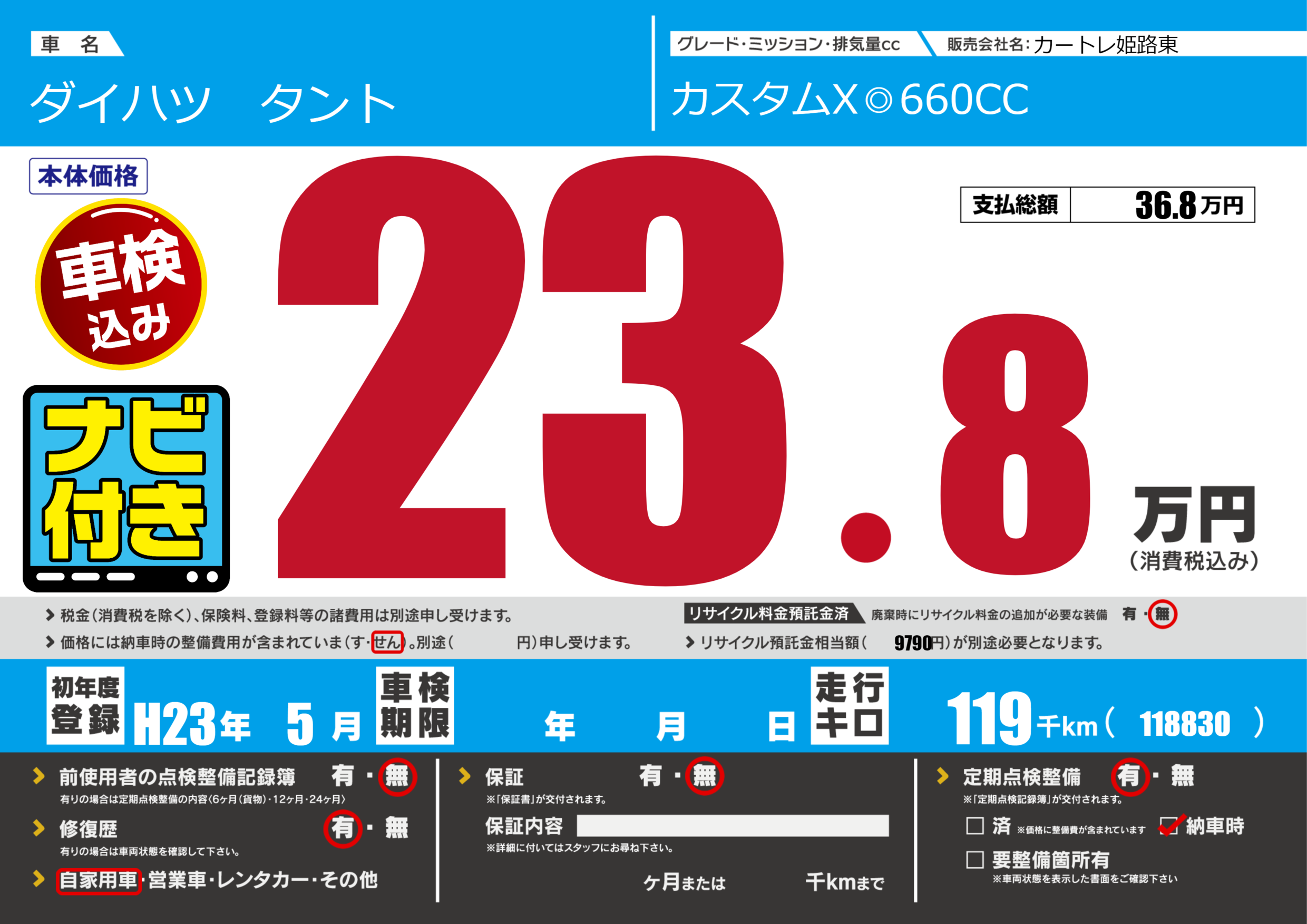 | 走行キロ | 11.9万km | 初年度登録 | H23年5月 |