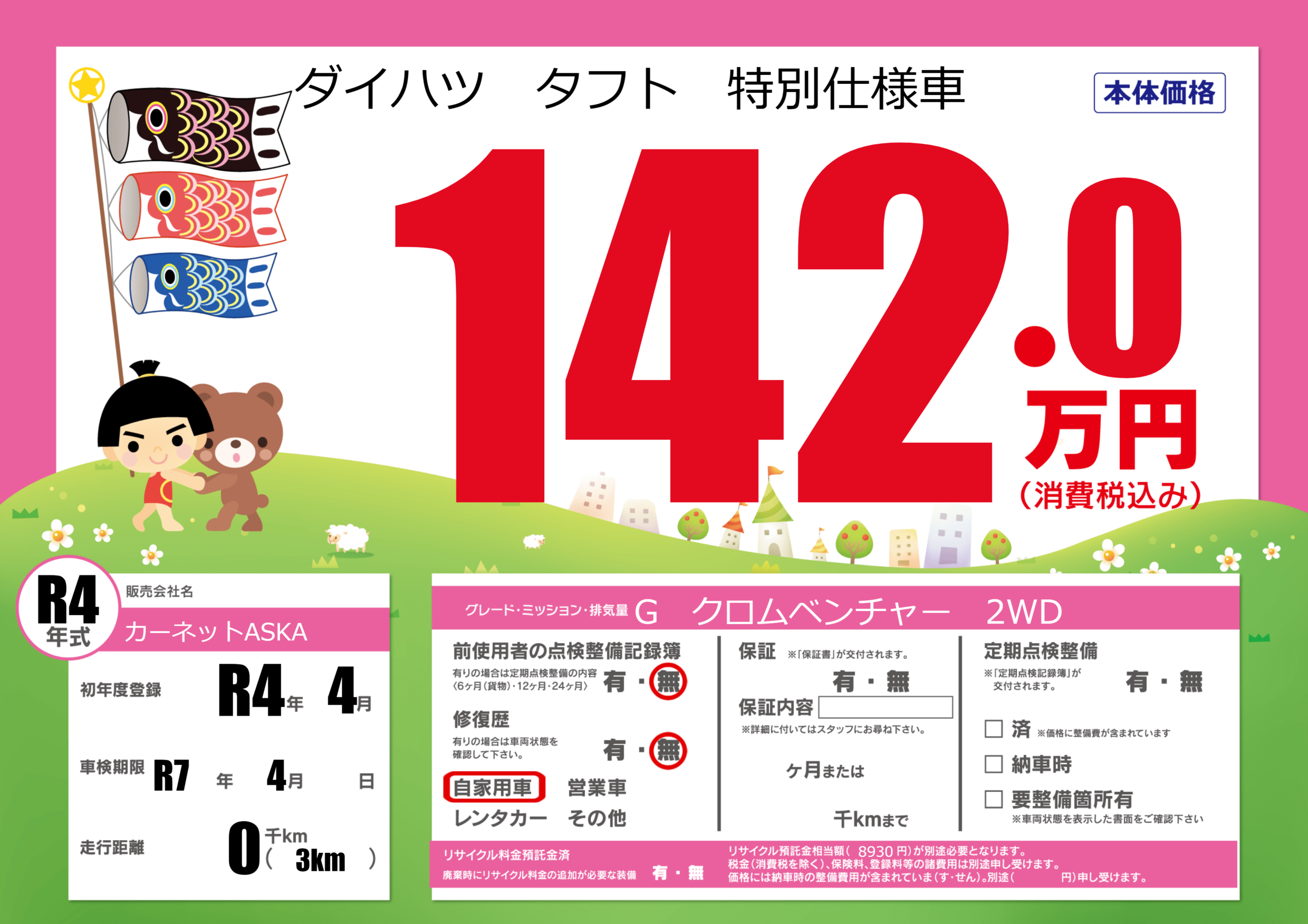 | 車名 | ダイハツ タフト 特別仕様車 | グレード ミッション 排気量 |
