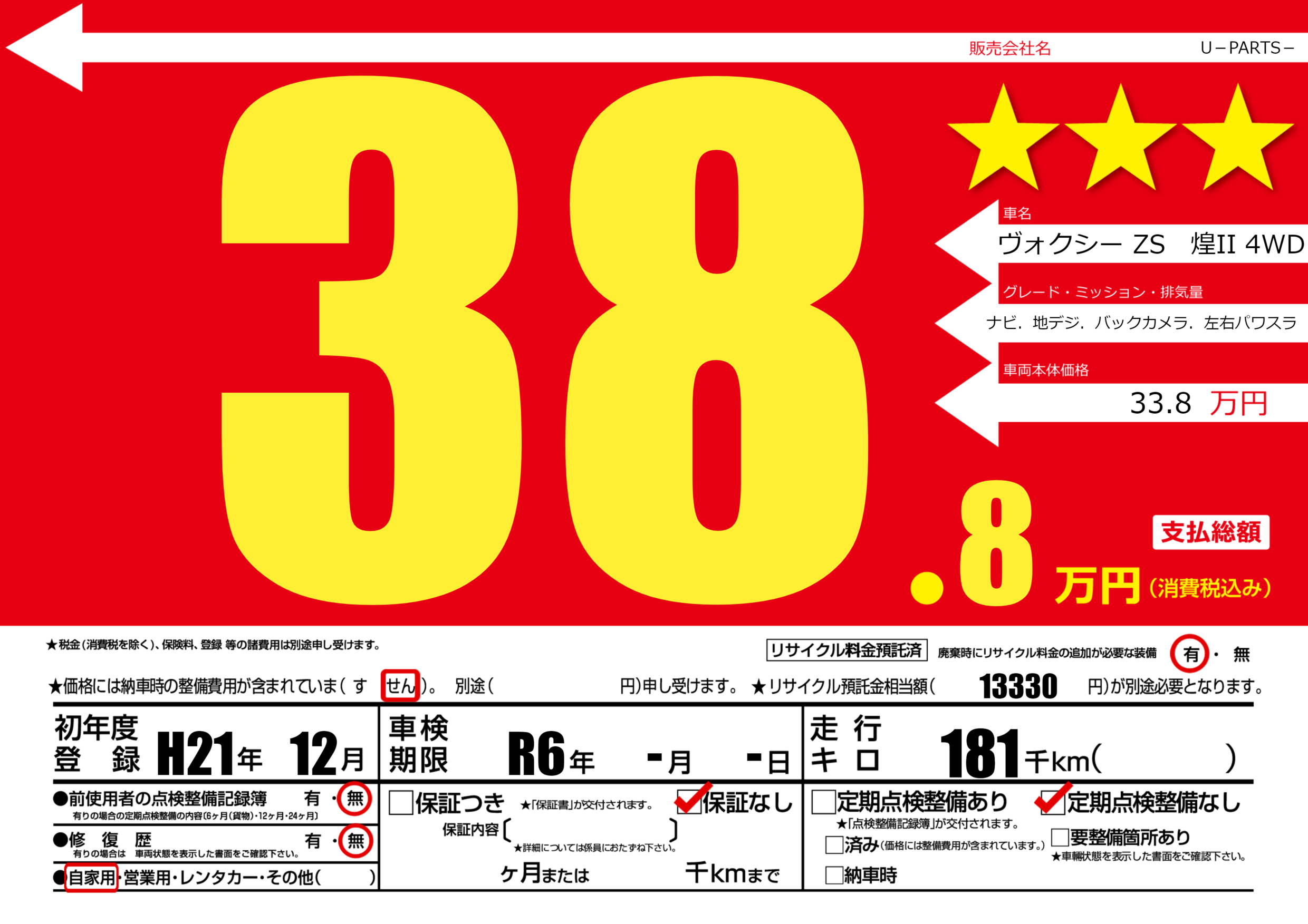 | 走行キロ | 18.1万km | 初年度登録 | H21年12月 |