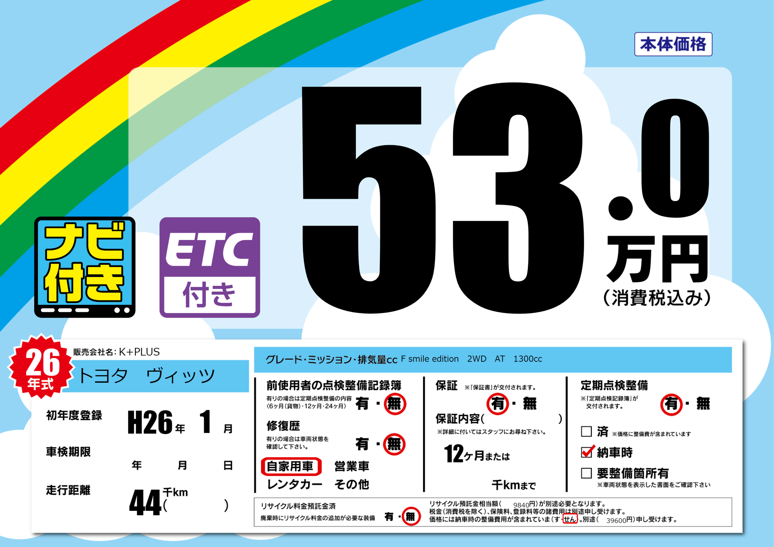 | 車名 | トヨタ ヴィッツ | グレード ミッション 排気量 |