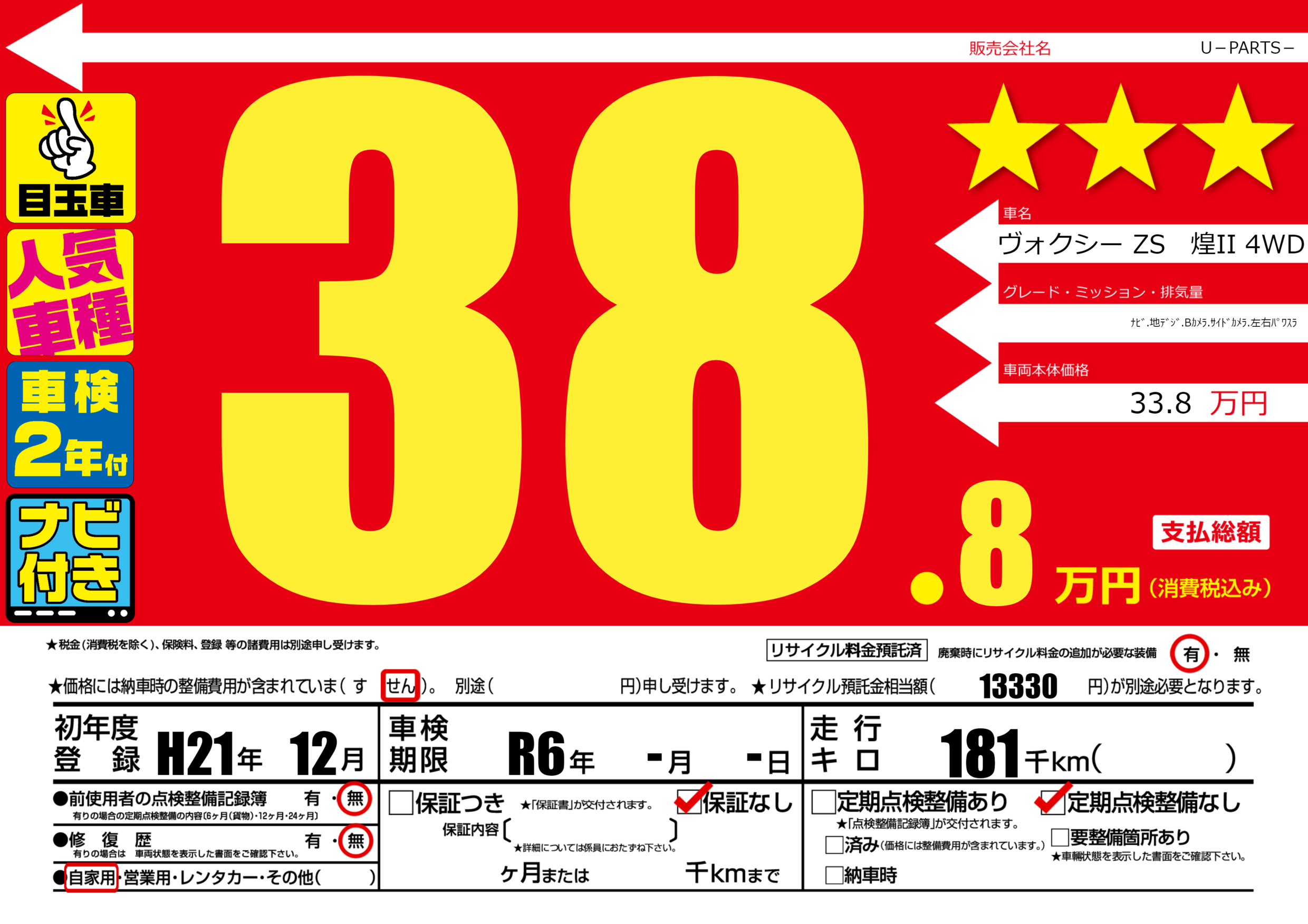 | 走行キロ | 18.1万km | 初年度登録 | H21年12月 |