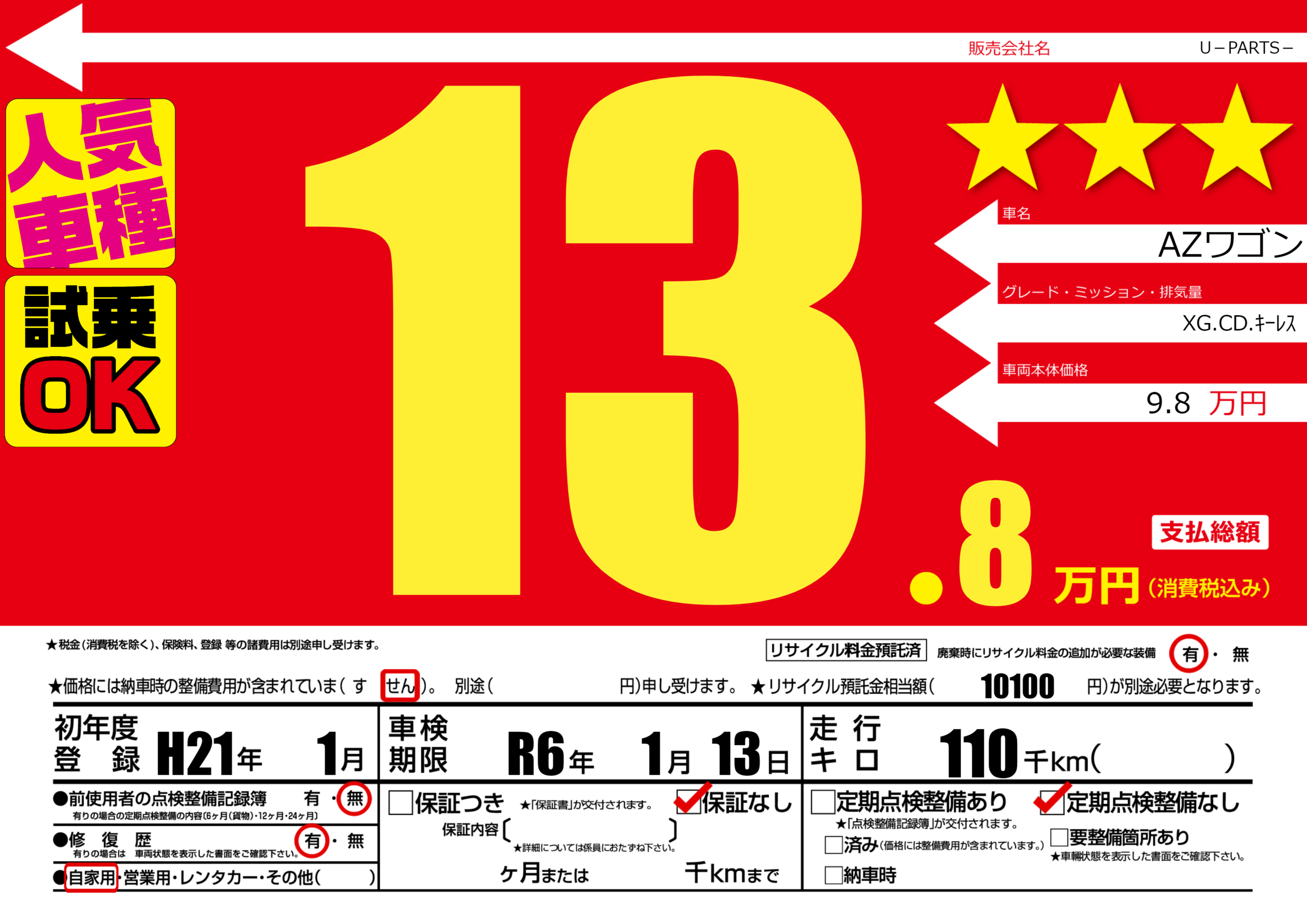 | 走行キロ | 11万km | 初年度登録 | H21年1月 |