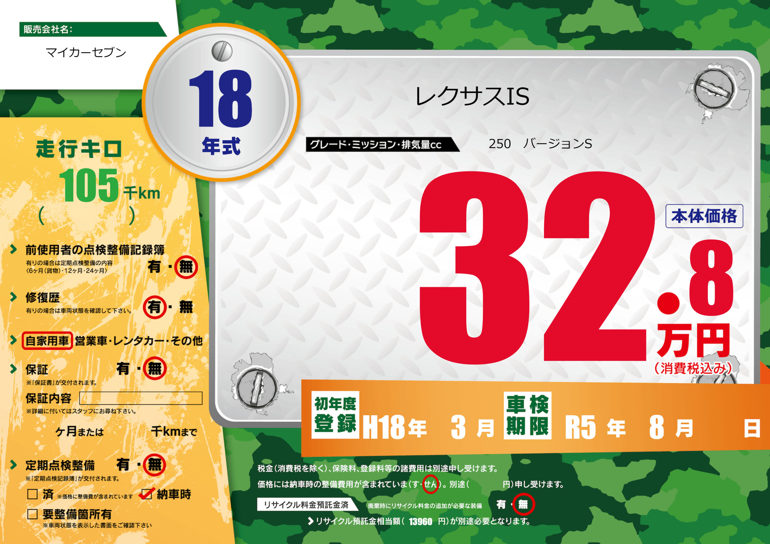 | 車名 | レクサスIS | グレード ミッション 排気量 |