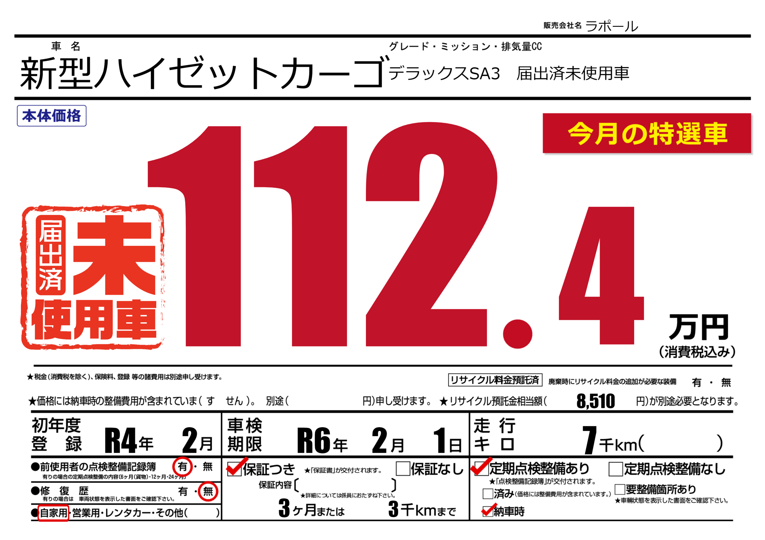 | 車名 | 新型ハイゼットカーゴ | グレード ミッション 排気量 |