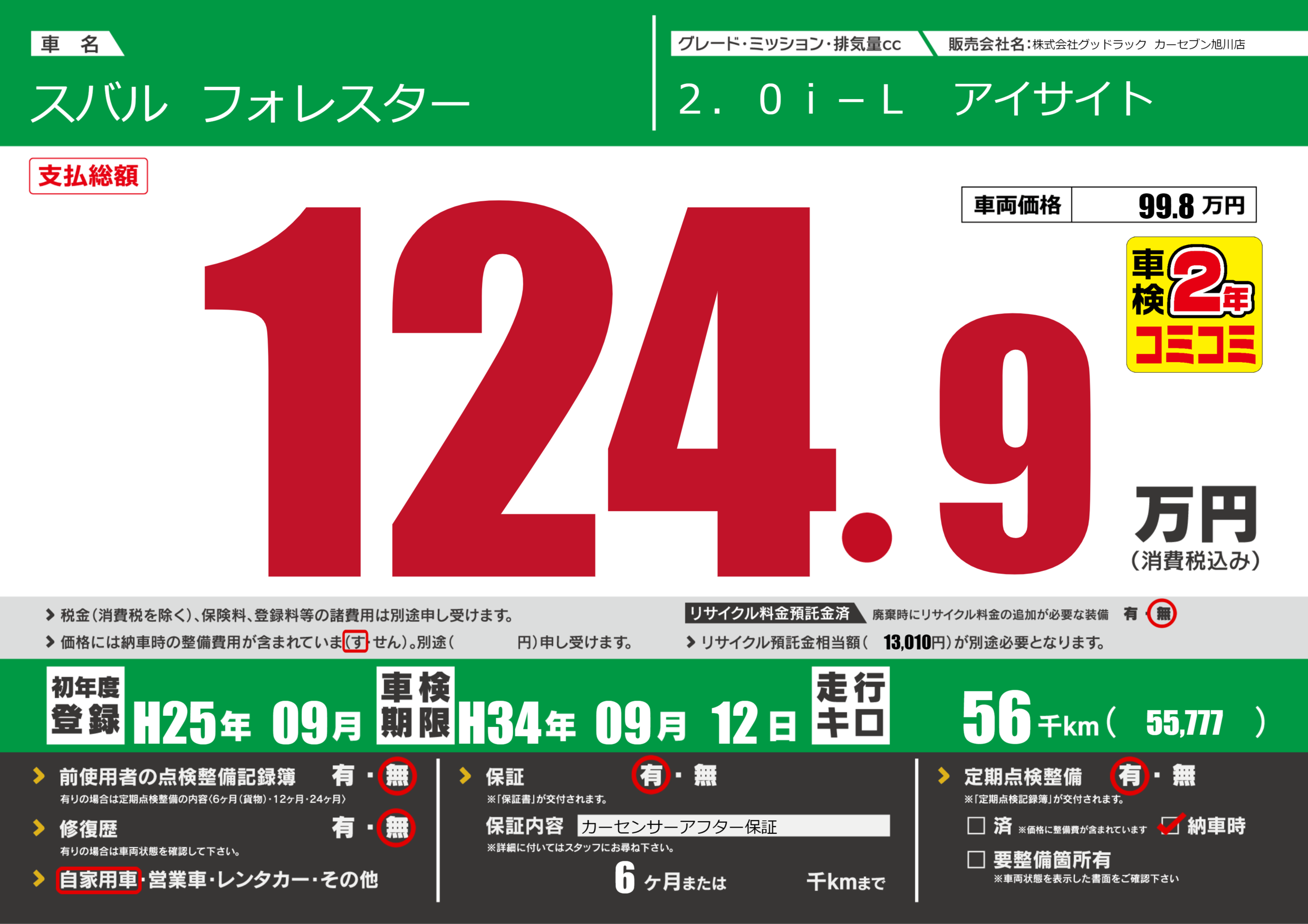 | 車名 | スバル フォレスター | グレード ミッション 排気量 |