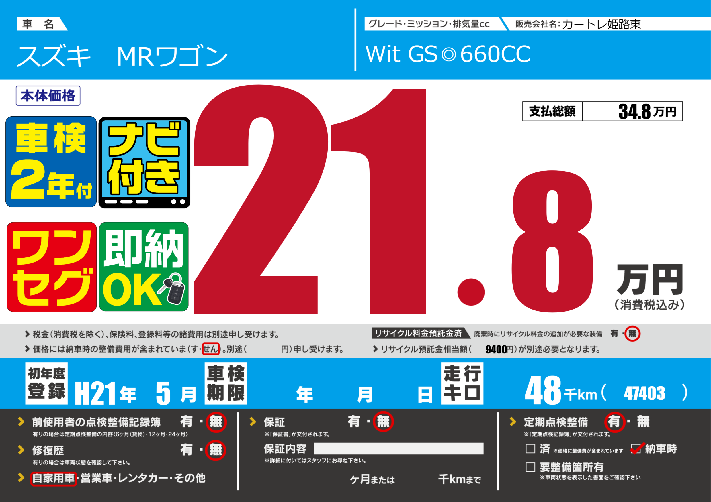| 走行キロ | 4.8万km | 初年度登録 | H21年5月 |