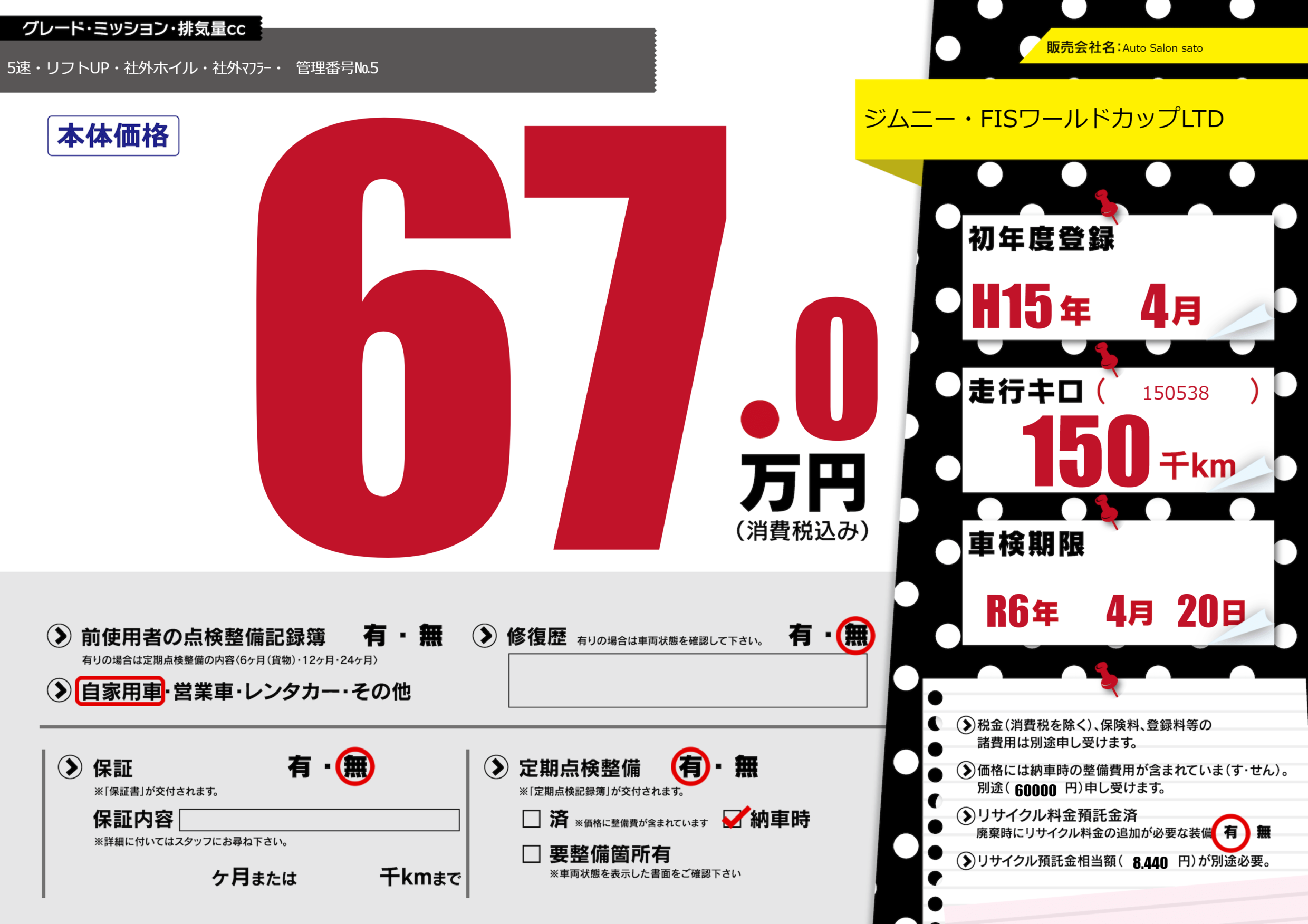 | 車名 | ジムニー・FISワールドカップLTD | グレード ミッション 排気量 |