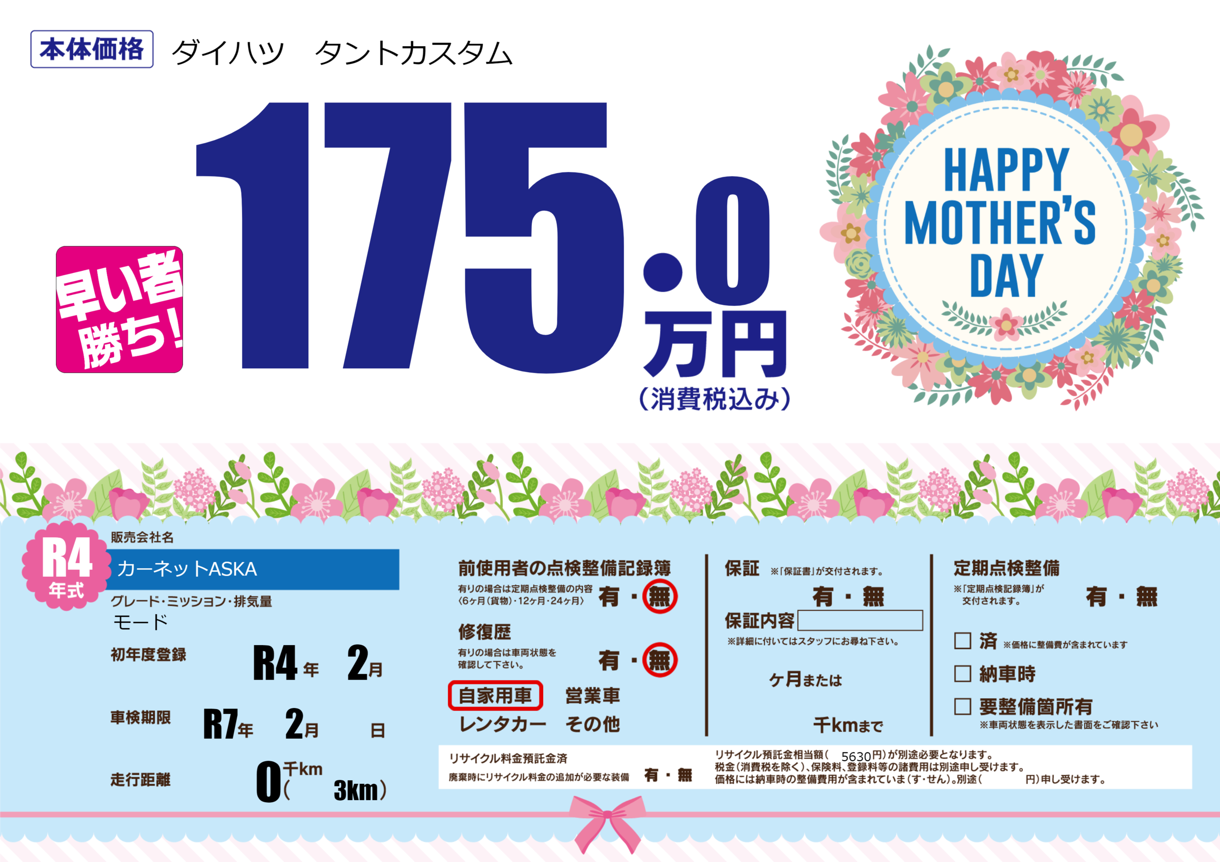 | 車名 | ダイハツ タントカスタム | グレード ミッション 排気量 |
