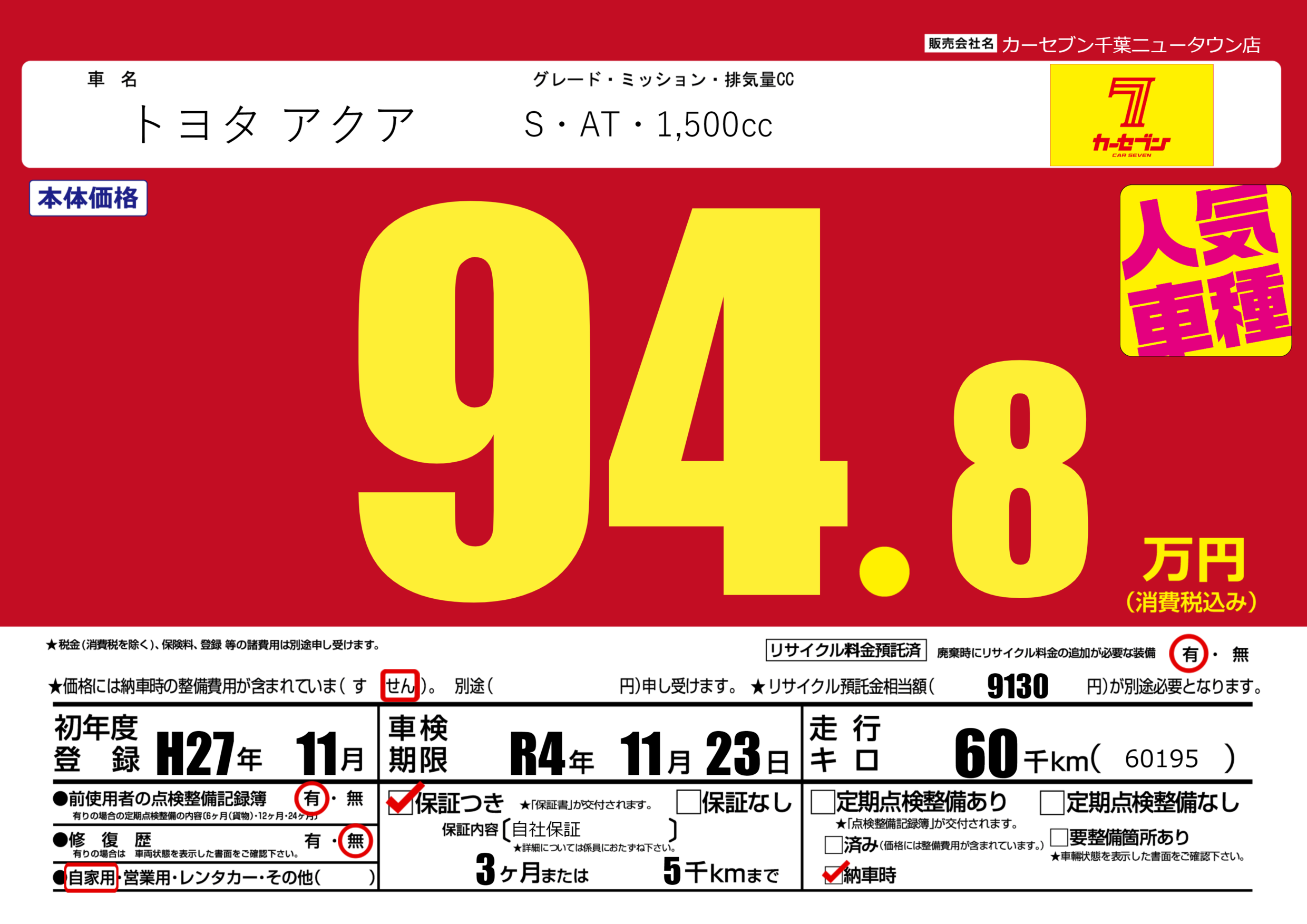 保証付き 保証内容(自社保証) 3ヶ月または(5)千kmまで |