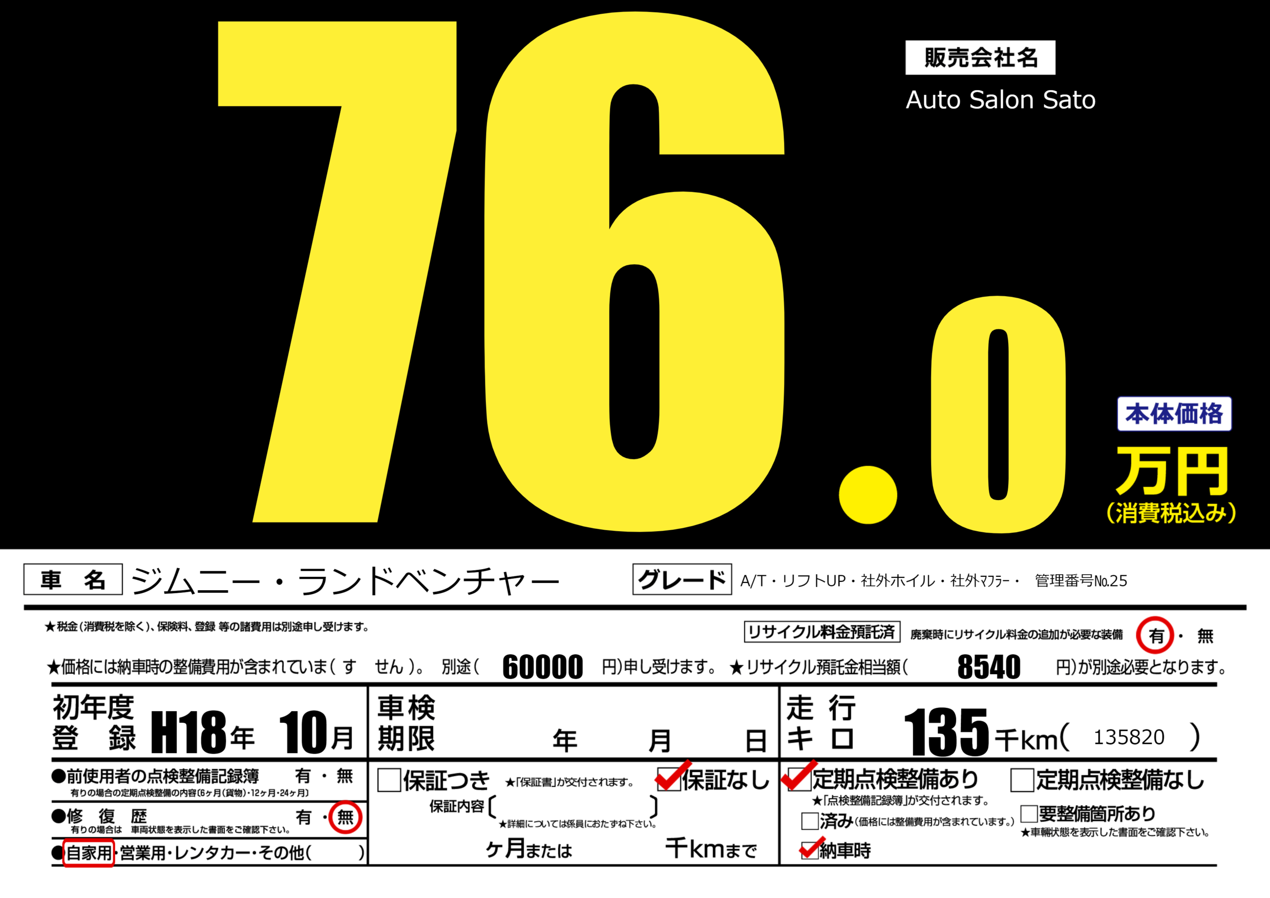 | 車名 | ジムニー・ランドベンチャー | グレード ミッション 排気量 |
