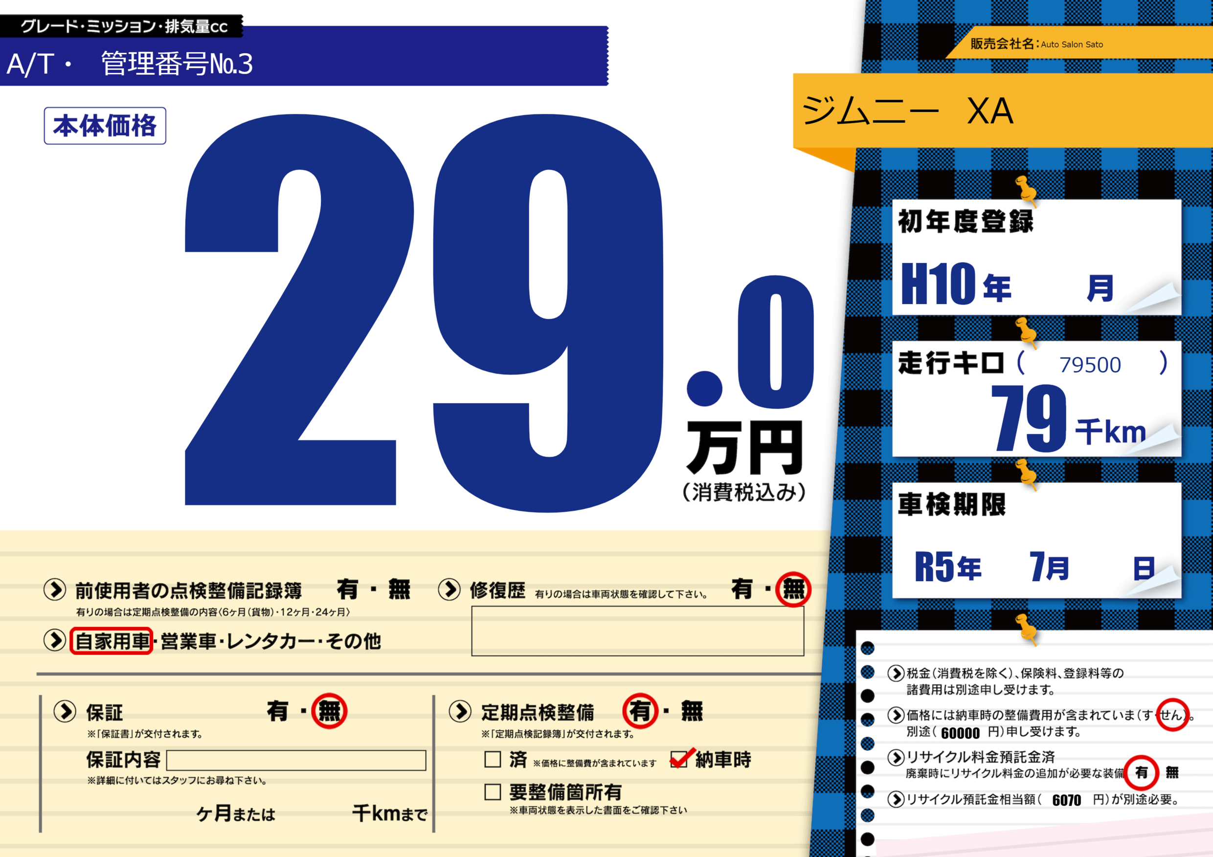 | 車名 | ジムニー XA | グレード ミッション 排気量 |
