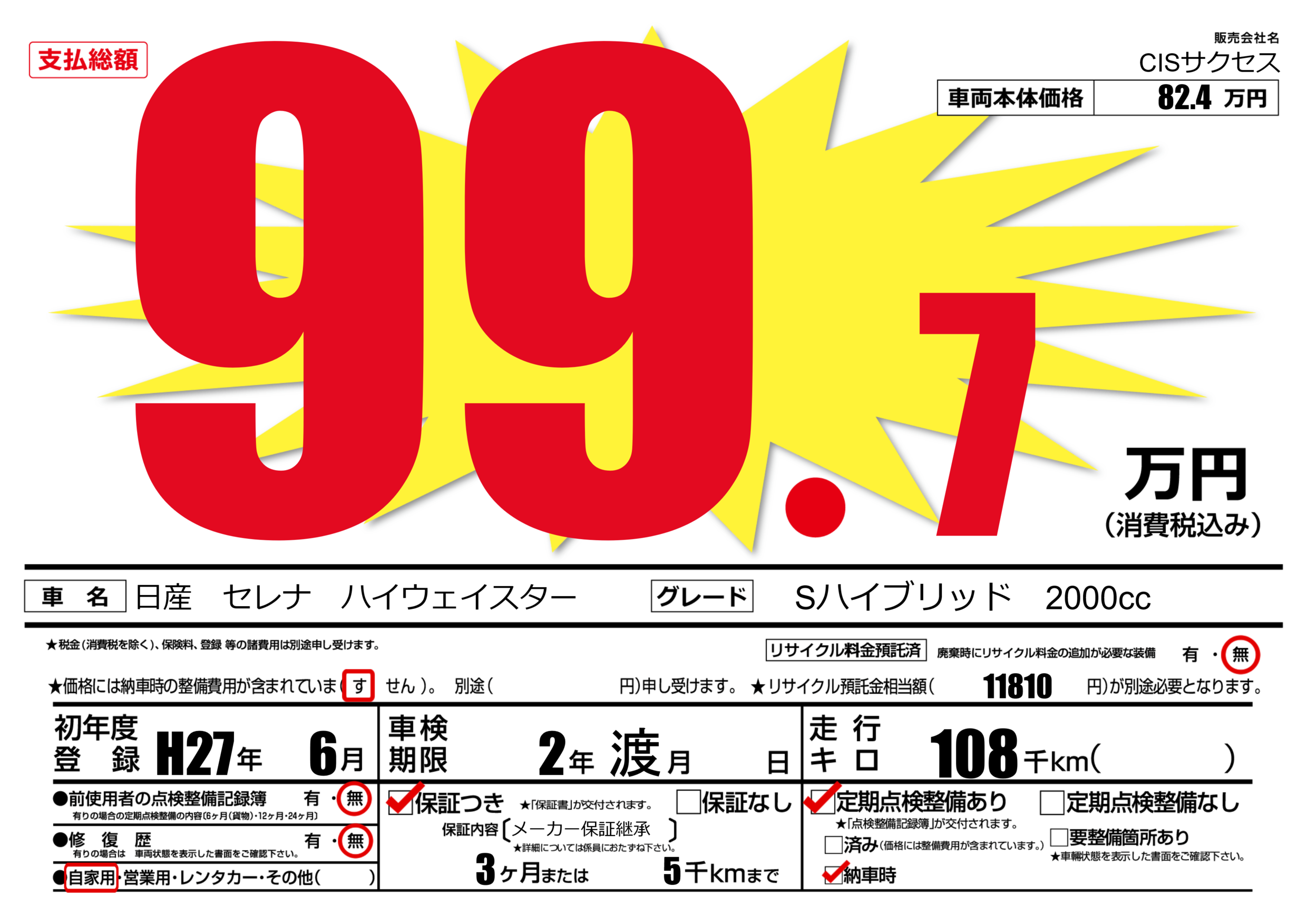 | 走行キロ | 10.8万km | 初年度登録 | H27年6月 |
