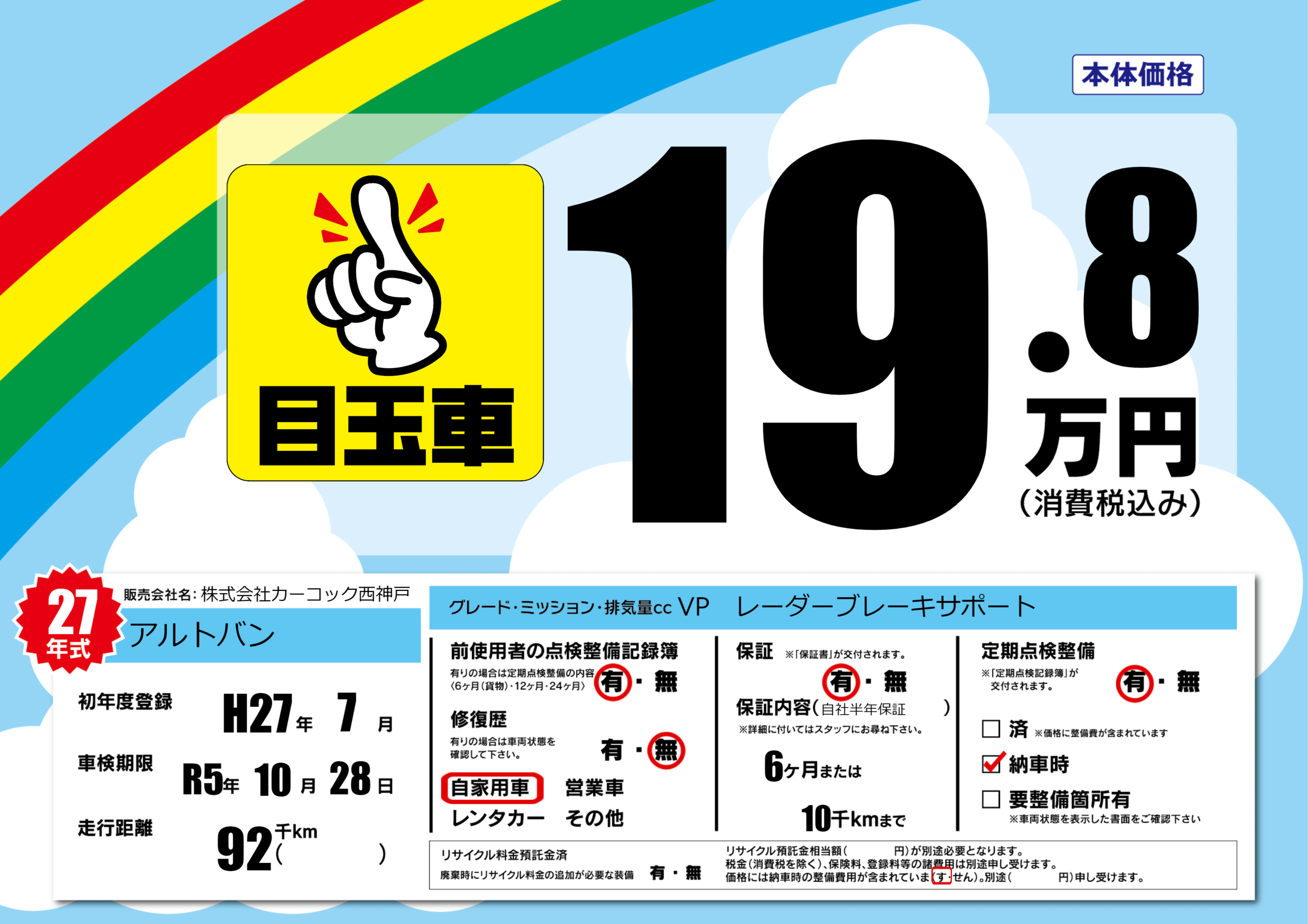 | 定期点検整備 | 定期点検整備あり 納車時あり | ||